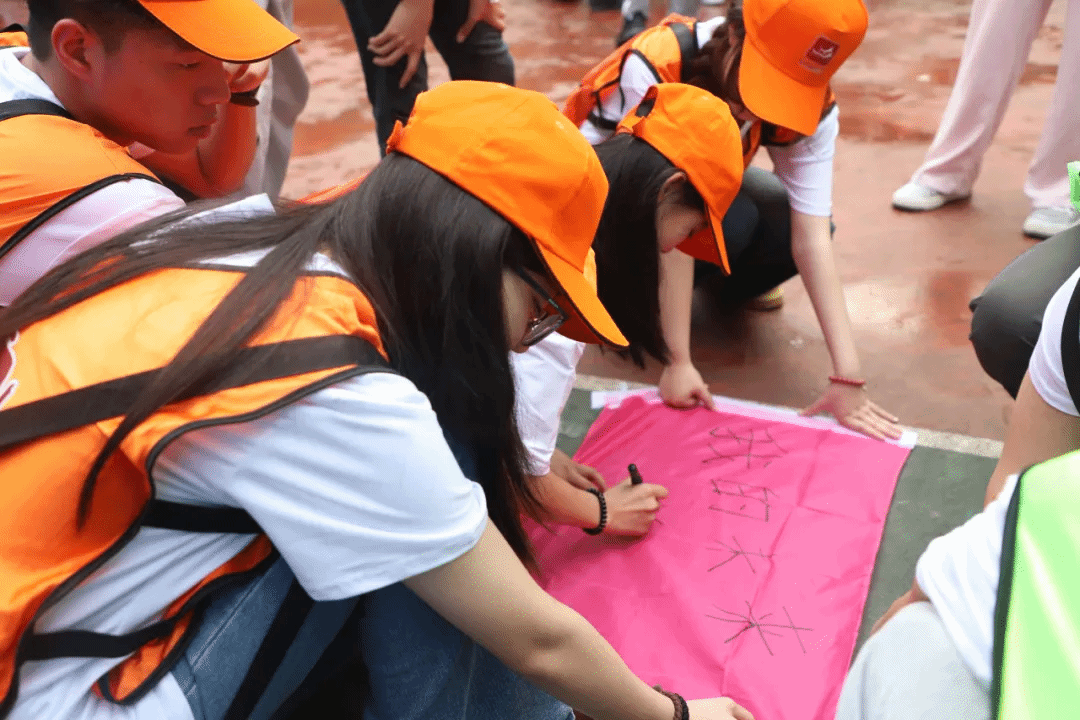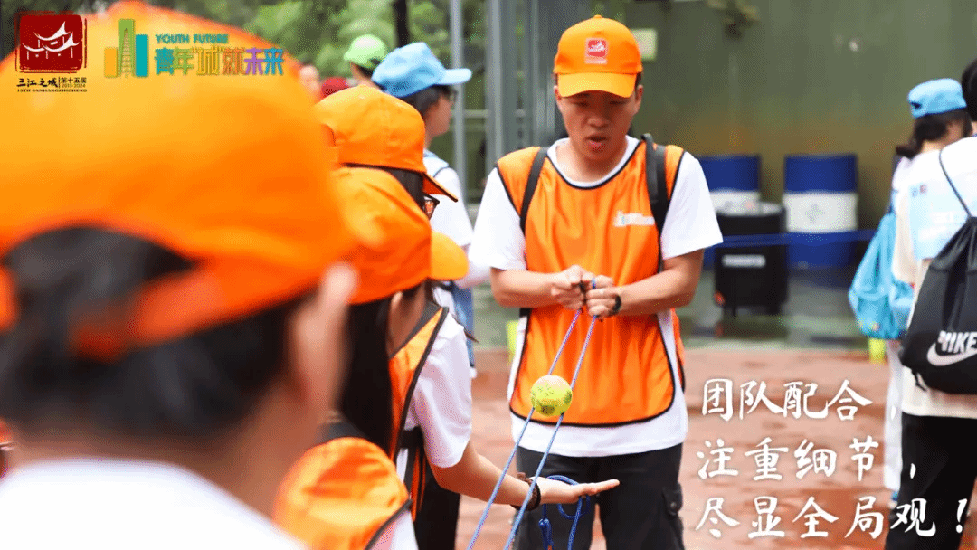 早上7点,工作人员拿着各自的装备到达,参赛队员们也紧跟其后。随后在营地教练程光涛教练和团委负责老师的组织下,迅速集合好了参赛的六支队伍。在了解参赛之前队员们都不熟悉,所以程教练先是让他们相互认识,促进队员之间熟悉度,形成队员之间的团队意识。其次程教练发布各小队的第一个任务,组建自己的团队文化,队名、队歌、团队口号,团队文化的形成是团队在这两天生存中的一缕坚定力量。团队文化建设后,是对团队的考验。营地教练张雪如教练随后给队伍布置了第一项挑战项目—能量传输。每一队两两组队手拉长度两米的绳,形成一条轨道。随后每队形成三条轨道,将网球放置于轨道上,利用两人配合一高一低的状态,将球在轨道上滚动,最后通过队员之间的配合、沟通、和相互的理解完成项目。