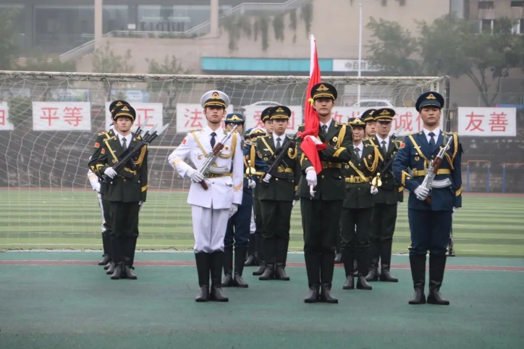 清晨7:20整,升国旗仪式正式开始。国旗仪仗队的同学们迈着整齐划一、铿锵有力的步伐,护送着五呈红旗正步走向旗杆。全体师生面向国旗肃立致礼。随着激昂的《义勇军进行曲》响起,师生们注视着五星红旗再再计起,在熠熠晨光中迎风飘扬。