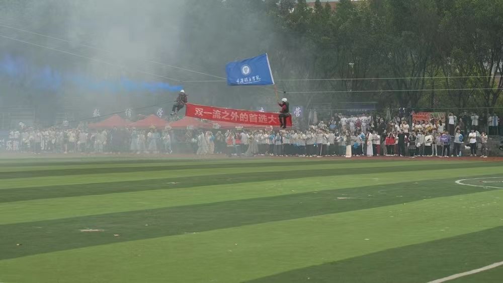 索道高悬任翱翔,速降极限展锋芒!开幕式绚丽的烟花之后,索道速降表演在各方阵上空迅速展开——看,他们如飞鸟般疾驰而下,代表着竞技体育的勇气与极限!生命的意义在于创造和喜乐。他们带着致力于未来成为“双一流”之外的首选大学建设贡献价值的主张,如一支离弦的利箭,射向锁定瞄准的目标。就如同重庆移通学院发展如利箭一样,以惊人的速度在创新的道路上不断攀登新教育的高峰。营地教育中心的索降队员们所展现的高超索降技术和精彩的空中表演引得全校师生阵阵喝彩。