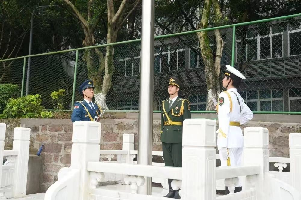 “正步——走”随着指挥员口令的下达,装容严整、英姿焕发的国旗护卫队率先入场。国旗护卫队是我们营地教育中心的学生组织,队员们整齐列队、步履铿锵,在全校师生的注目下,护旗方队擎着国旗,眼神坚毅、神情自豪地护送着鲜艳的五星红旗阔步迈向主席台。