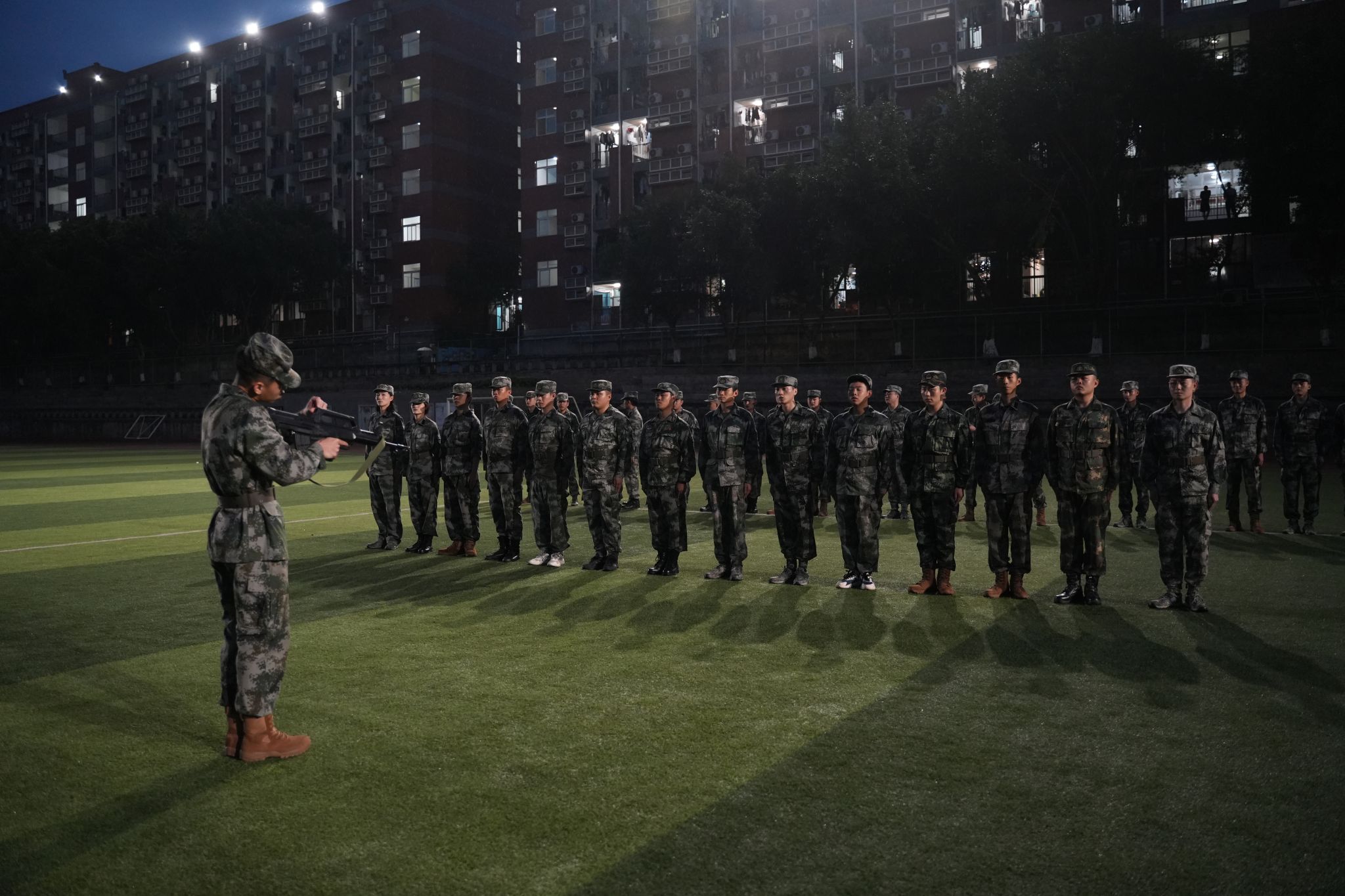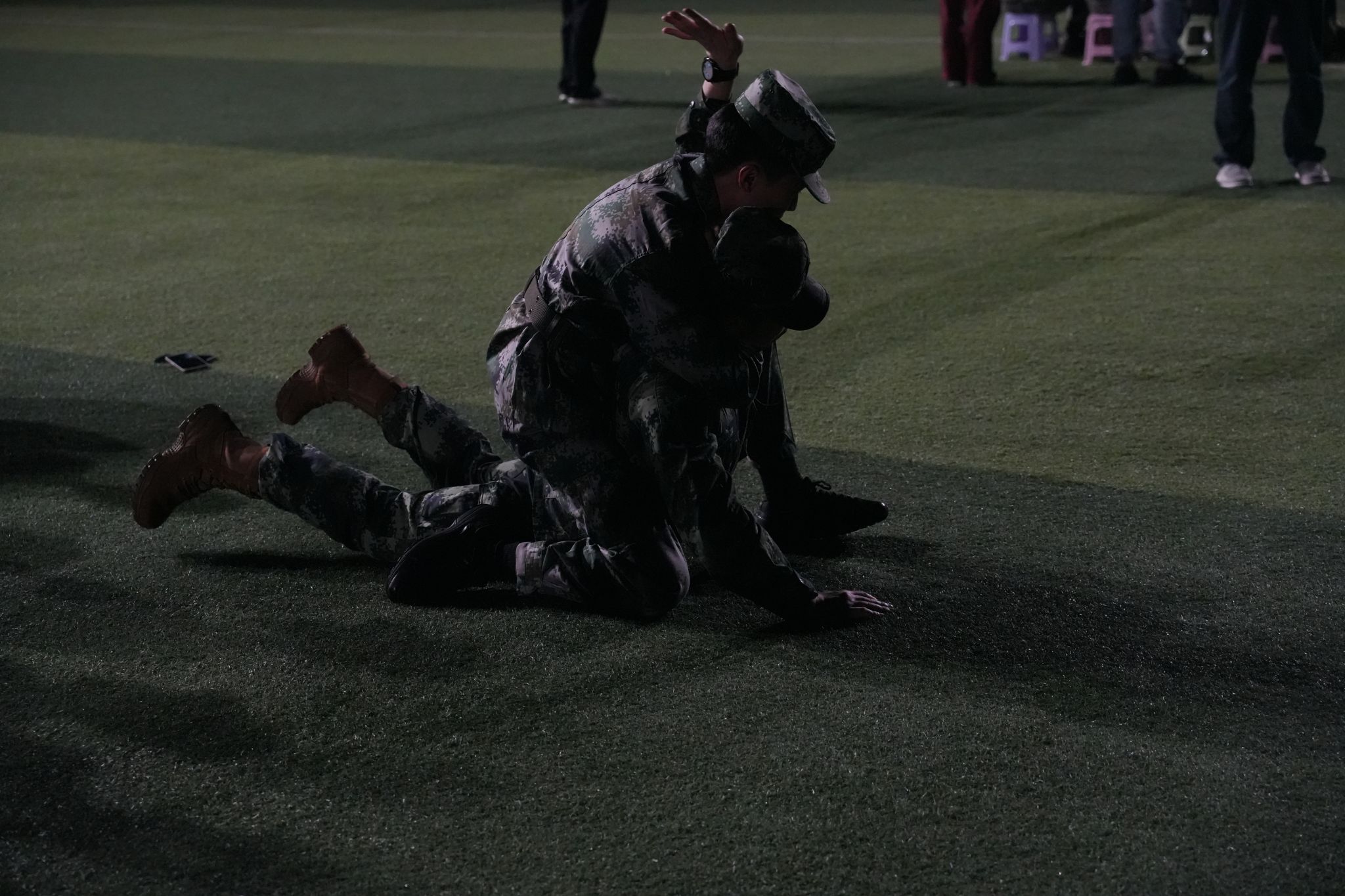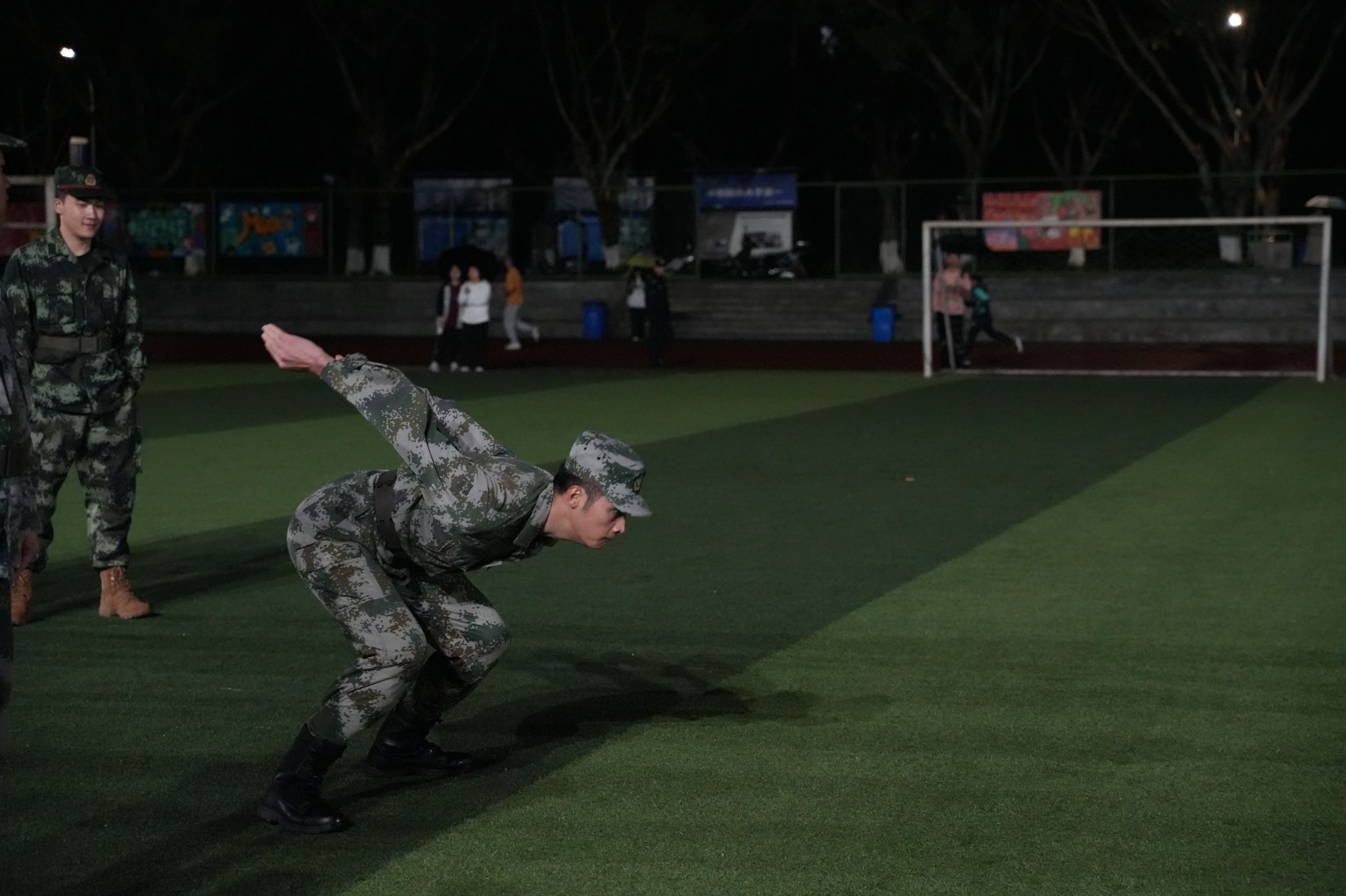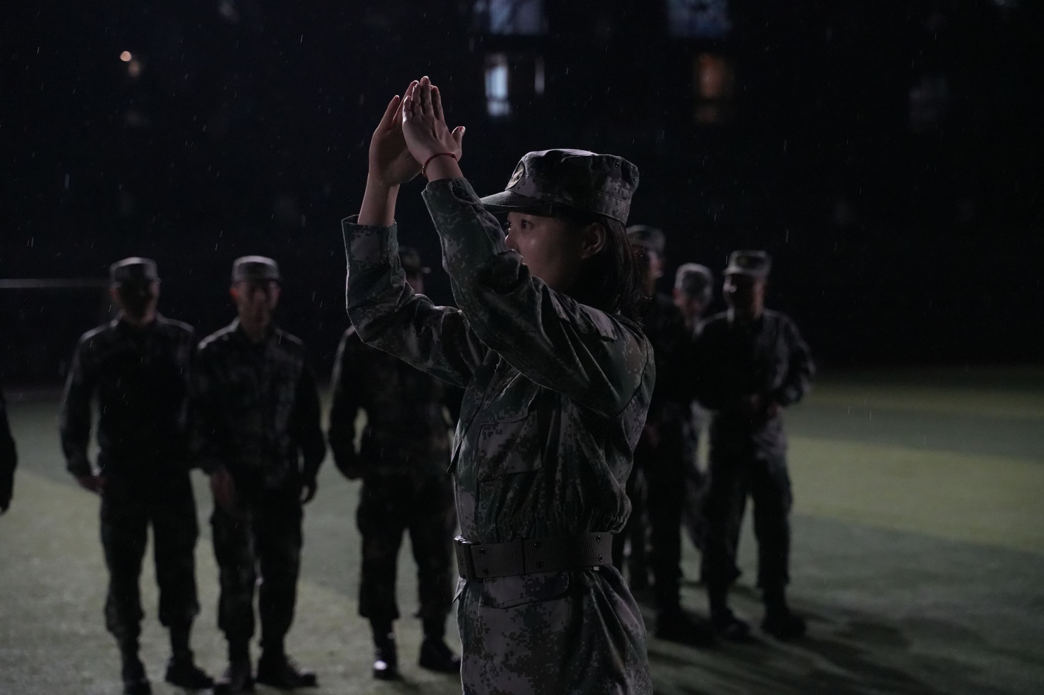 在他们的军旅生涯中,除了硬性的教学课程,他们也注重全面发展,手语舞,侧倒,前倒,前扑,擒拿术,军体拳等等,让原本压抑的场景变得更加欢快起来。