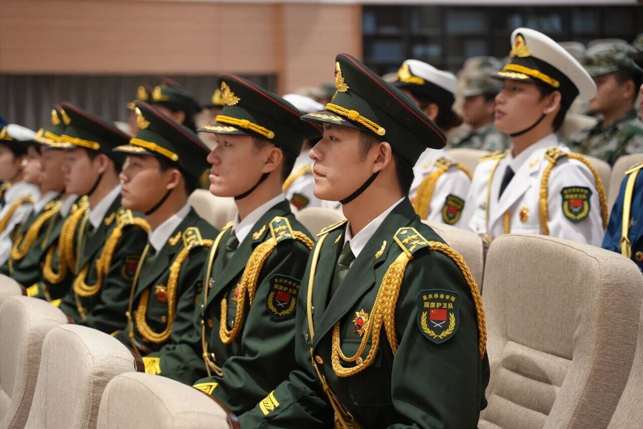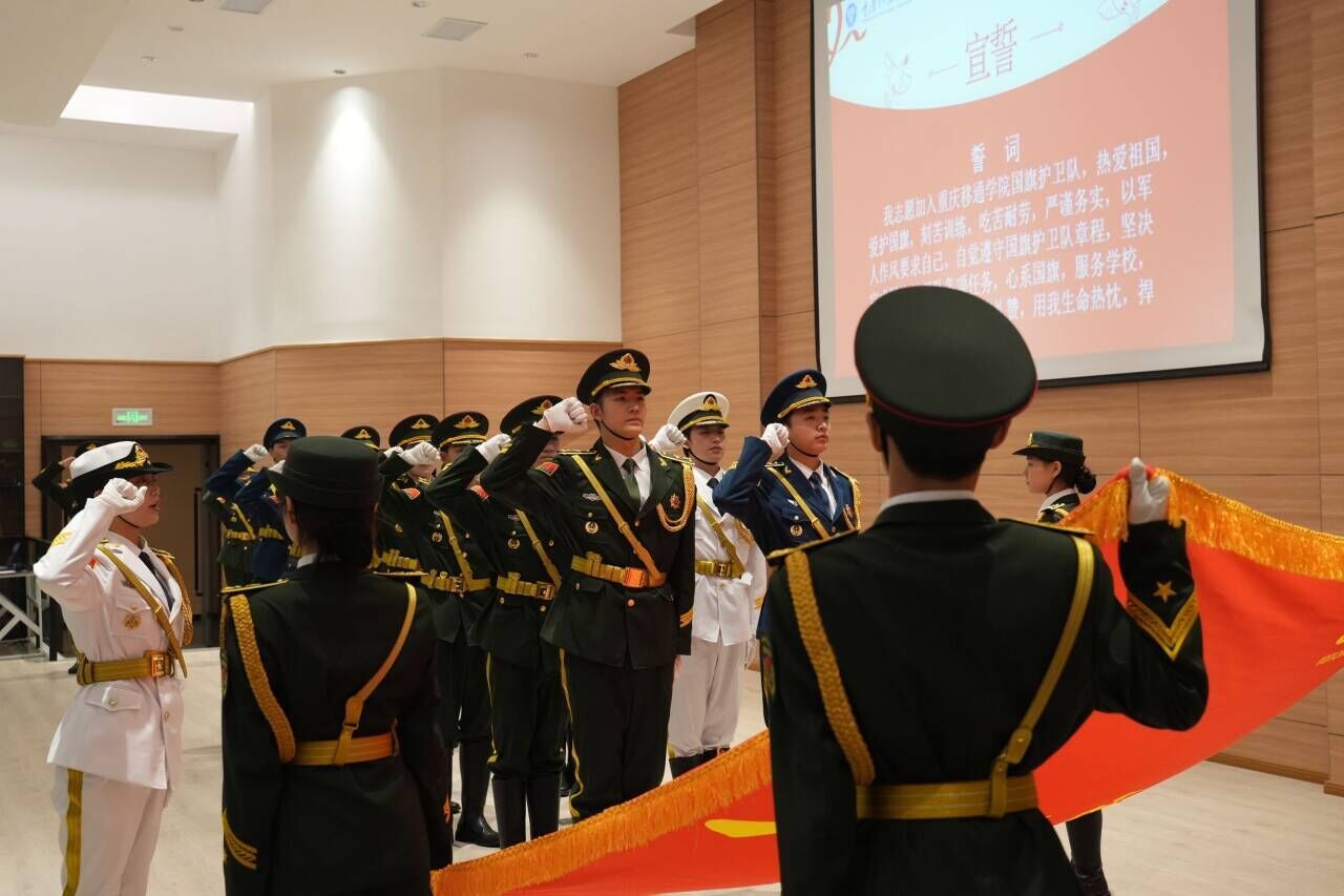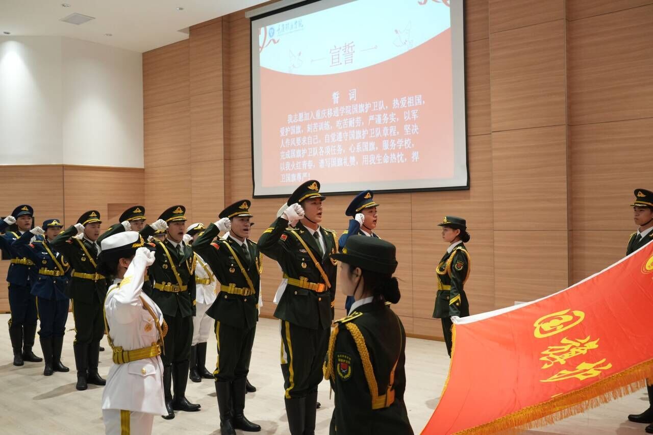 在热烈的掌声中,重庆移通学院学生处处长陈帅郑重地为“国旗护卫队”授旗。队员代表任政浩昂首挺胸,接过了象征着荣誉与责任的队旗。这一刻,国旗护卫队的队员们使命感油然而生,他们将肩负起守护国旗、传承爱国情怀的重任。