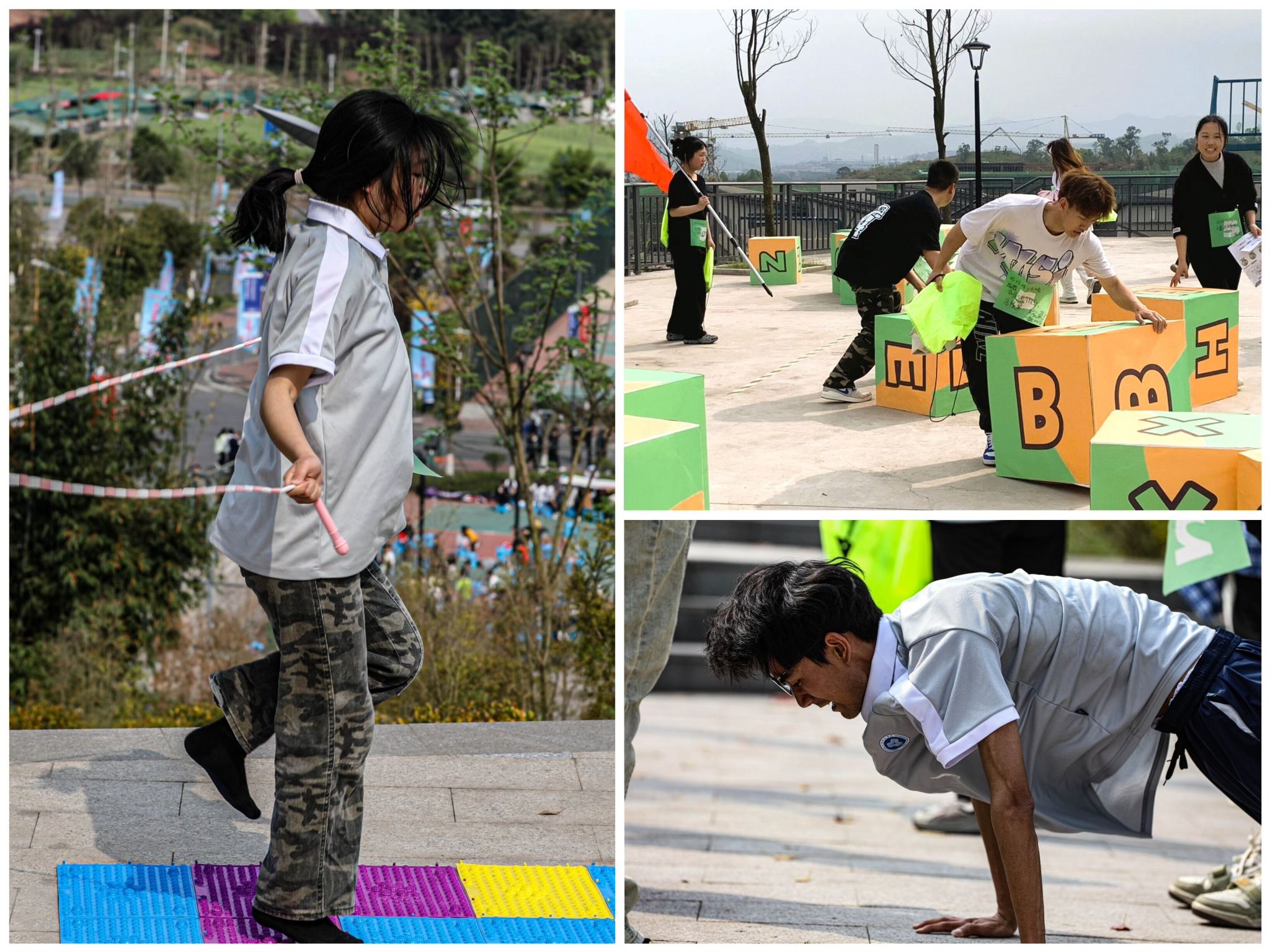 除了体能的极限考验,参赛选手的战术思维和反应速度也是此次比赛的必考环节。活动现场设置体力+智力双赛道,通过体力、耐力、脑力等突破行为,不断考验师生的爆发能力和体能状态,助力参赛师生在脑力、思维等多重挑战中享受自我突破和登顶巅峰的成就感。参赛者们在指压板、哑铃等道具的硬核加持下,解锁“疯狂小竹笋”带来的解压体验;在波比跳、深蹲的极限挑战中感受了体能突破、暴汗燃脂;眼观智力路线,玩转思维、烧脑推理,与书院文化、体育科普、英文填词等相关的益智环节,让参赛者们绞尽脑汁,体验了一场酣畅淋漓的头脑风暴。