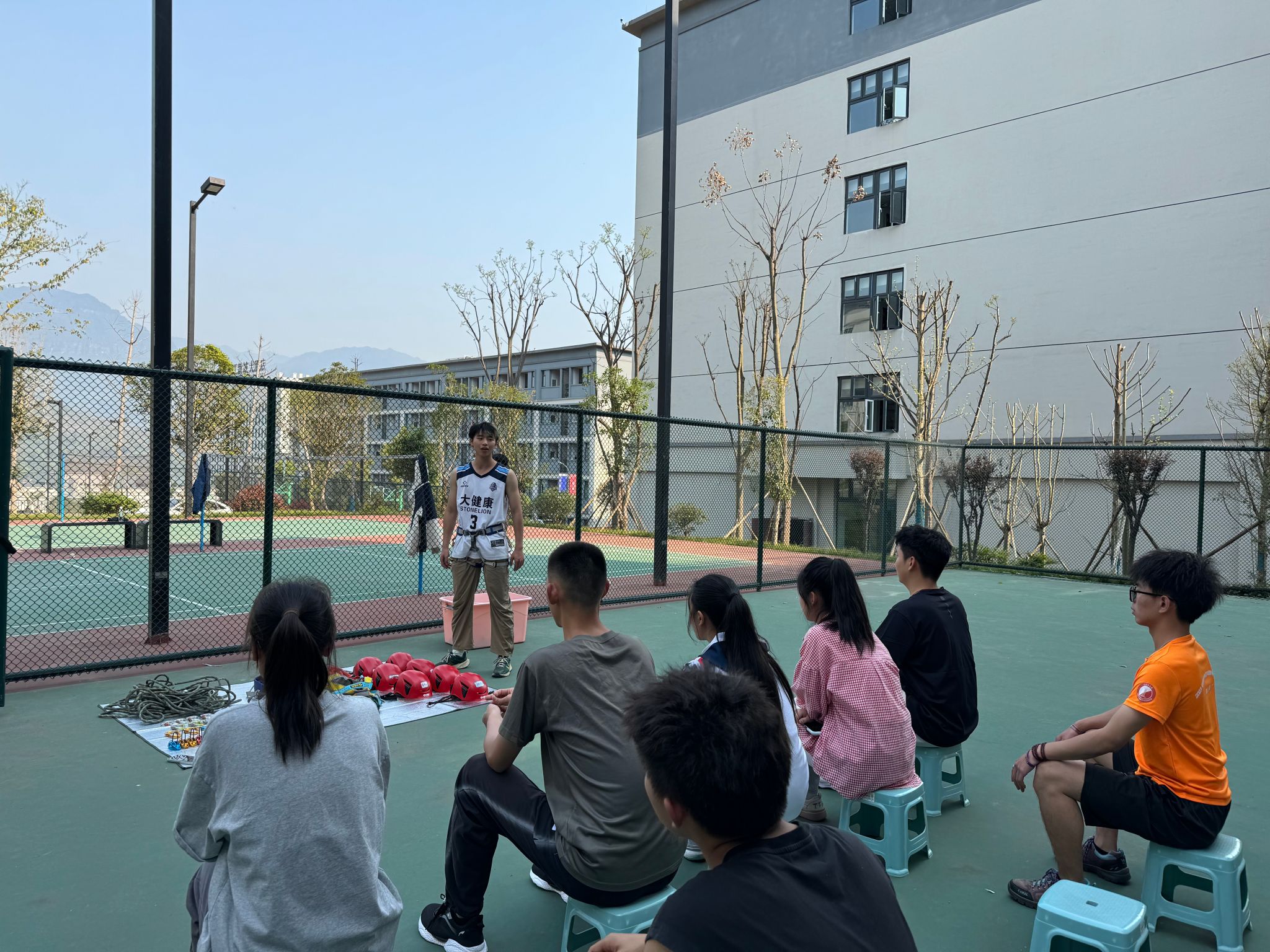 活动伊始,喻正坤同学向大家介绍了户外攀岩所需的装备,包括安全带、头盔、120厘米和60厘米扁带等等。利用实际承重22千牛、15公斤等数据向助教团成员详细解释了每个装备的作用以及正确穿戴方式并严格警告要正确穿戴装备。在户外攀岩项目中,正确的装备穿戴和合理的绳网布点是确保自身安全和顺利攀爬的关键。助教团成员们不仅认真听取专业的讲解,对后面的实操也充满兴趣。