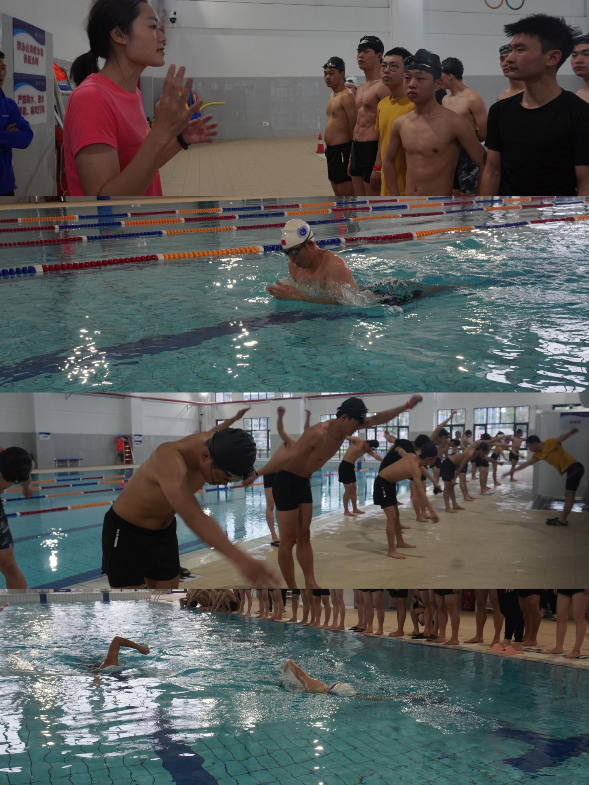 本次活动包含技能讲解、技巧展示、课程体验三个环节。教练组织同学们进入游泳馆进行参观,并强调了“游泳池安全注意事项”。换上衣服做好热身后,由校队队员下水进行四种泳姿的展示,教练针对各姿势技术动作运用技巧进行详细的讲解,同学们在教练的指导下亲身下水体验,感受游泳的无穷魅力。