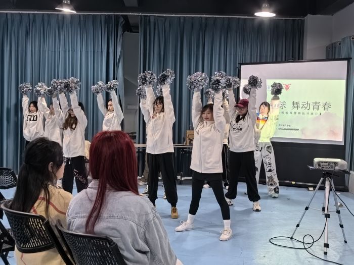第三站,Twinkle的小星星们还为参加开放日的同学展示了一套日常训练基本功,结束后还以观看国外比赛视频形式来让他们更加深刻认识到我们啦啦操的种类是十分广泛且多样的。