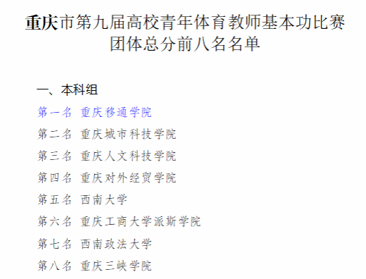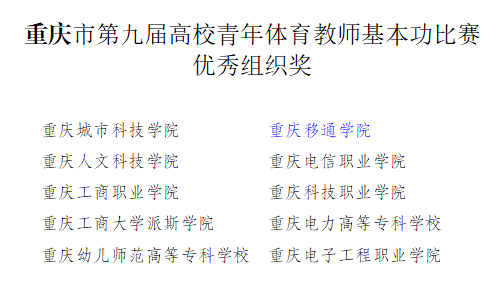 1月14日,由市教委主办、西南大学承办的第九届高校青年体育教师基本功比赛在西南大学顺利结束。在本次比赛中,重庆移通学院获优秀组织奖和本科组团体总分第一名,同时还有22名移通老师获得个人奖项。