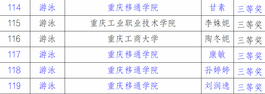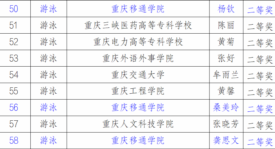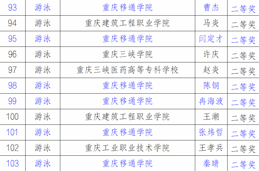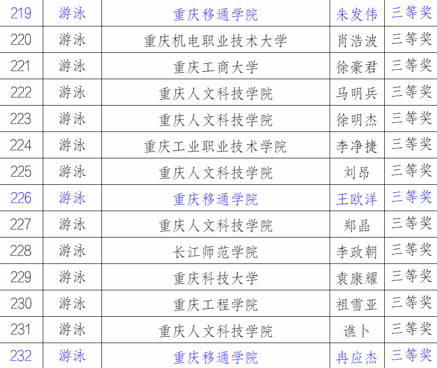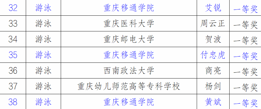 在男子组比赛中,重庆移通学院艾锐、付忠虎、黄斌、杨闯获一等奖;曹杰、闫定才、陈铜、冉海波、张炜哲、秦晴、陈天青获二等奖;朱发伟、王欧洋、冉应杰获三等奖。