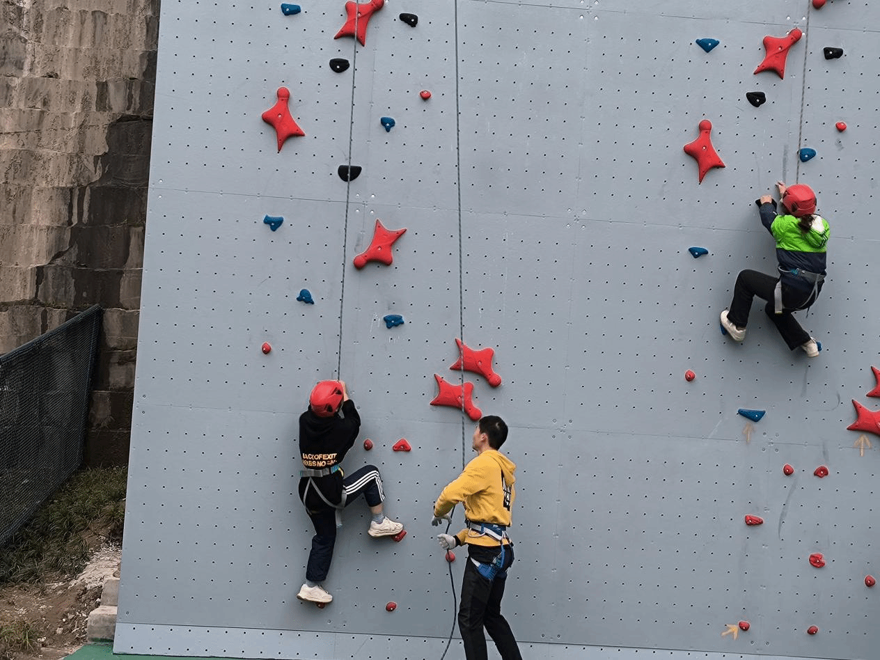 无惧无畏,勇攀高峰。攀岩是一项向上攀爬的运动项目,通常被归类为极限运动,需要同学们克服恐惧,不断攀升。在攀岩项目中,教练首先为同学们讲解和示范了安全护具的穿戴,并在小队长的辅助下,确保每位同学的护具穿戴正确。面对垂直的攀岩墙,同学们没有害怕,依次向上攀登。在攀登过程中,总有同学因为体力不支或手部擦伤而想要放弃,但在教练们和队伍成员们的呐喊鼓舞下,依旧能再向上攀登一大段,所以人生不设限,只需大胆向前。