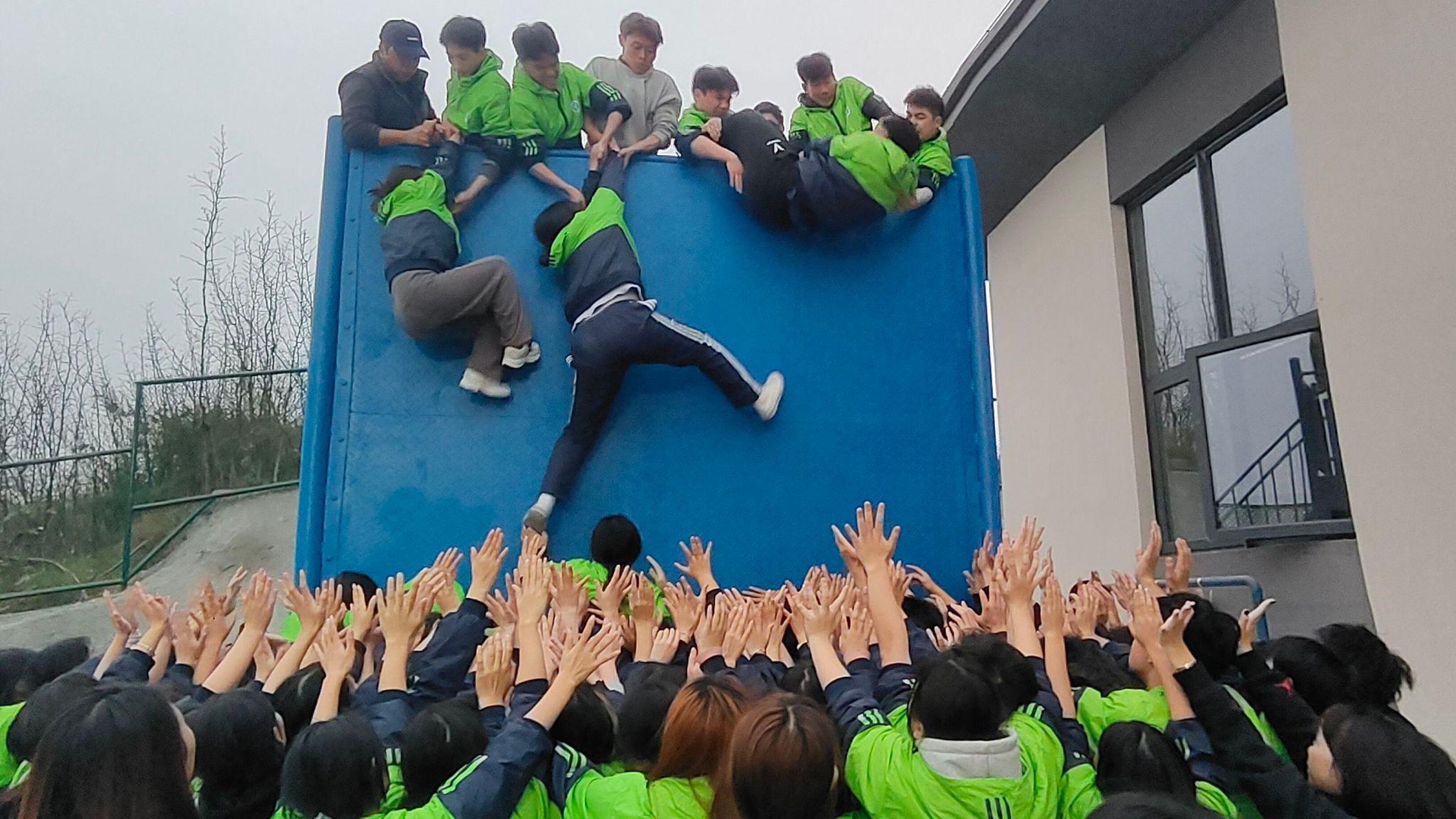 最扣人心弦的一个项目是“毕业墙”。在这个环节中,同学们需要合力越过四米高的墙。这挑战不仅是对个体勇气的考验,更是对整个团队凝聚力和协作能力的极大挑战。在教练的引导下,同学们通过充分的沟通、默契的配合和团队成员的共同努力,最终成功地完成了这项训练。
