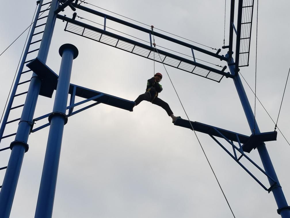 同学们积极参与了高空断桥项目,通过专业教练的指导,他们认真学习并掌握了如何正确穿戴安全设备,帮助其他同学穿戴相关安全设备,接受教练的安全核验后,为即将准备的同学加油,鼓励在断桥处徘徊的同学勇敢迈出第一步,坚持做更好的自己。同学们完成此次高空断桥项目,围坐在一起向其他同学分享自己的感受体验。