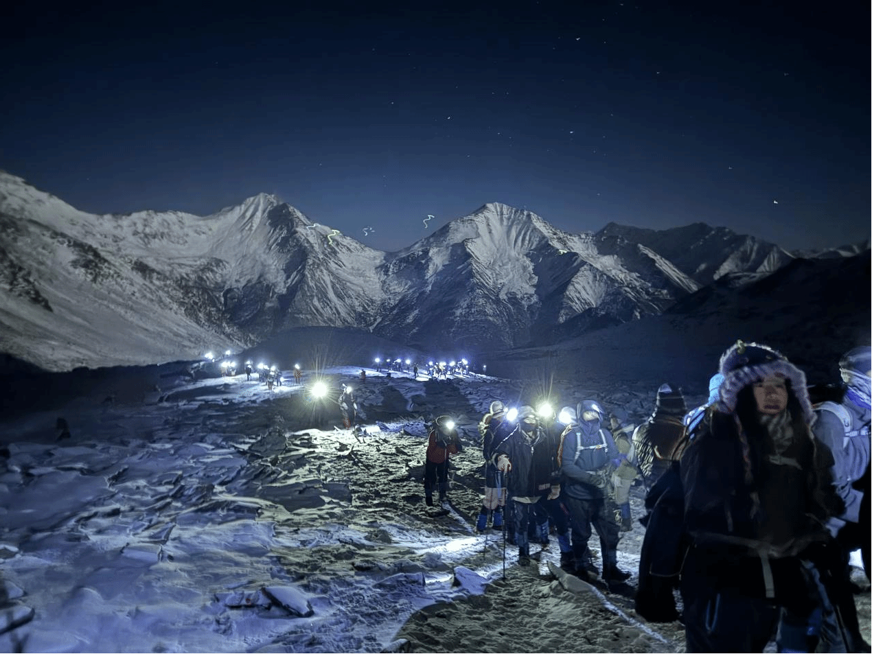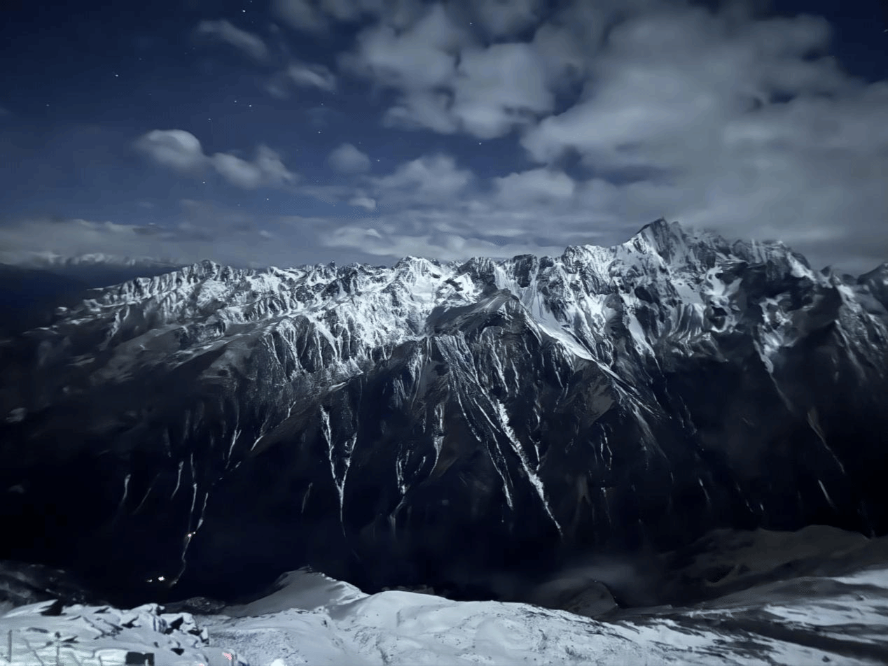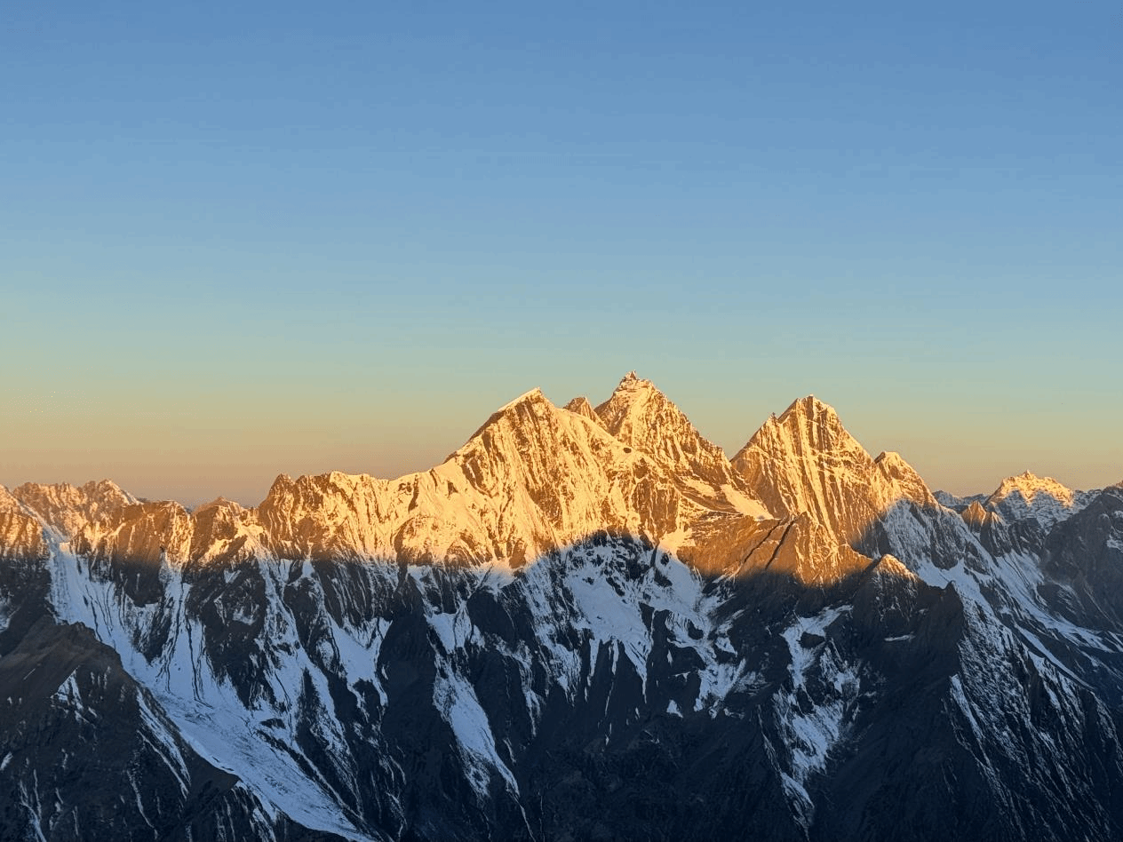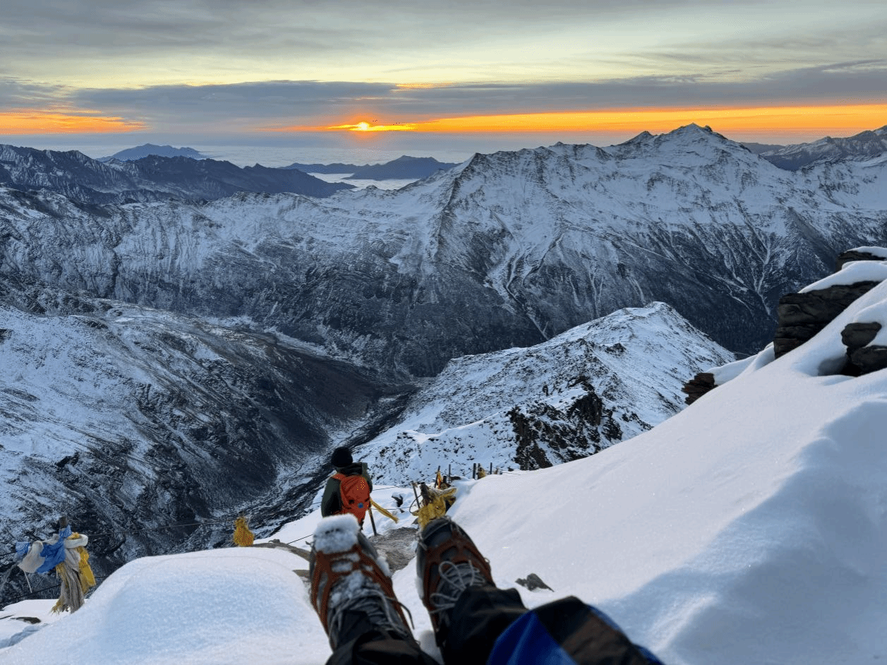 凌晨2点30分起床,头痛感不再了,呼吸也缓解了一些,准备好装备的她就要向山顶冲锋。冲顶海拔还会抬高500米,对于第一次攀登雪山的她来讲还有很大的难度,在攀登过程中她的小腿开始剧烈疼痛,刺骨凛冽的寒风呼呼地在她身边走过。此刻的她,已经有些神情恍惚,走在垭口到达大平台的路上,旁边就是万丈悬崖,她瞬间精神抖擞,抬头一瞬间万丈金光从天而降,雪山之巅被涂抹了一层金光。那一刻,她失了神,愣在原地,雪山是那么美、那么神圣!山顶就在眼前,向导催促她继续前进,加快脚步,当她听到向导说:“喂,过来拍照了!”她才意识到已经登顶了。