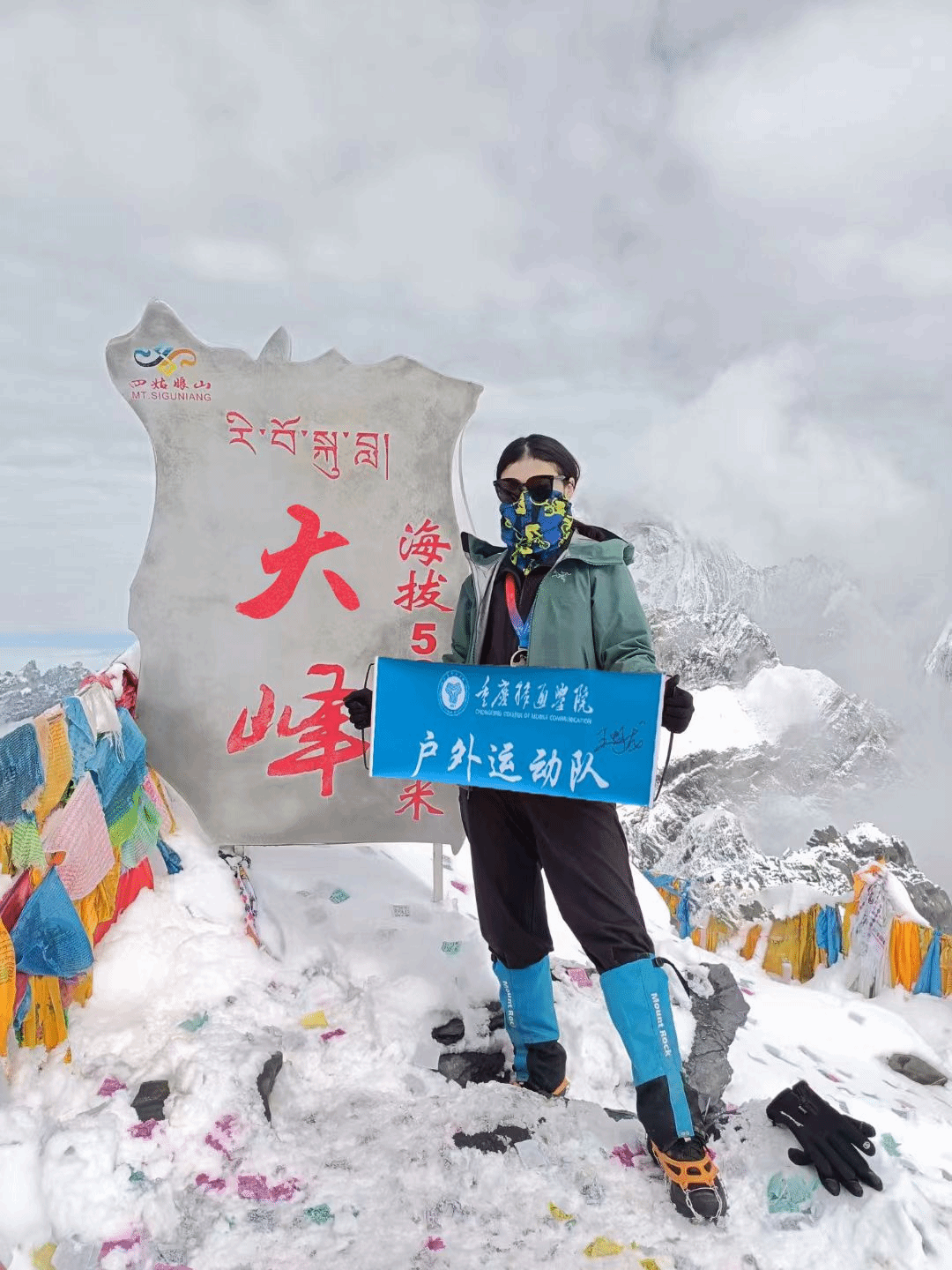 最终,罗诗琪同学带着那面登上过珠穆朗玛峰山顶的旗子登顶了四姑娘山大峰,这面旗子代表着对户外运动队队员无限可能、砺志笃行的寄语,承载着诸多人的希求和梦想。大峰的石碑巍然矗立,她在四周雪山的美色中久久伫立说不出话,眼眶不知何时湿润了,呼吸困难、小腿酸痛等不适通通被抛于脑后。她想起教练说过的一句话:“不是我们征服了自然,而是自然接纳了我们。”雪山是神秘、伟大的,上面的每一个脚印都留下了她虔诚的灵魂和炽热的心,我们仅仅是被雪山慷慨接纳的孩子。
