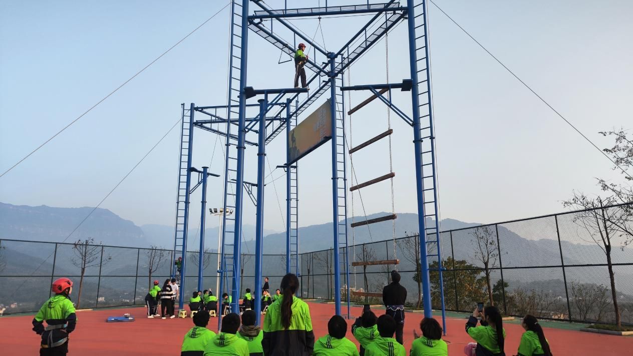 高空一小步,人生一大步。“高空断桥”对很多同学来说是一项十分苦难的挑战。当同学们攀登上断桥后,即使双腿颤抖、内心恐惧,但在教练的耐心指导与同学们的激励中,勇于挑战自我,跨越断裂的距离到桥的另一面并稳稳站立。突破是一个过程,须先经历心智的拘禁,继之是行动的恐慌,最后是成功的喜悦。高空断桥不仅提高了学生们的平衡水平,更让他们在面对困难时学会冷静思考,迎难而上。这种全面的体验式学习,使学生们深刻认识到挑战是成长的一部分,勇气与毅力是战胜困难的关键。