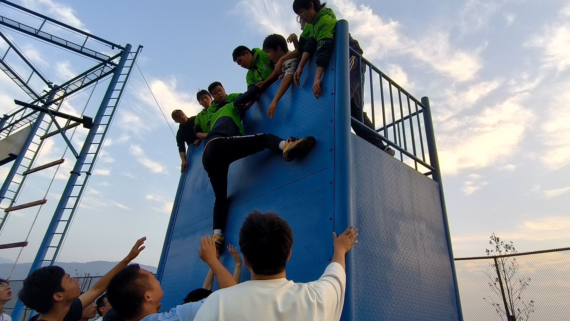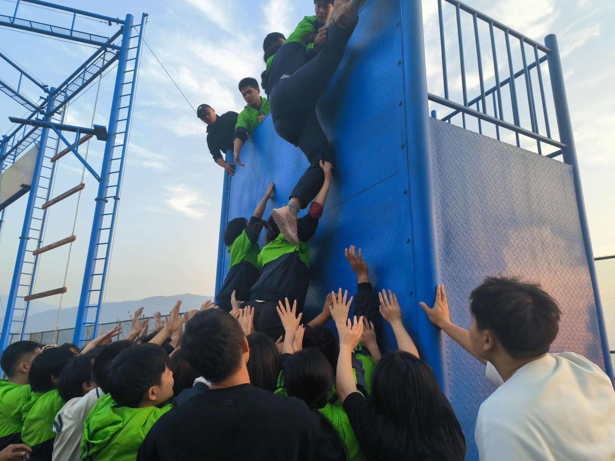 营地训练的最后一个训练课程是“毕业墙”。目标一致,拧成一股绳,信任队友。4.2米的高墙,不借助器械外物,刚开始的同学们都不相信自己能完成这个任务。第一名同学飞跃而上,拉上几名男同学后,保护女同学们优先上墙,力量较弱者紧密围绕在主梯副梯外的队友们,用他们坚定托起的双手,无声地告诉队友不用怕。习近平总书记所说的:“团结合作是最有力的武器。”一个人的力量是有限的,但团队的力量却是无穷的。甘心做主副梯的伙伴,用他们的默默付出,托起整个团队翻越的希望。最终97位同学在19分23秒时顺利完成了这项挑战。