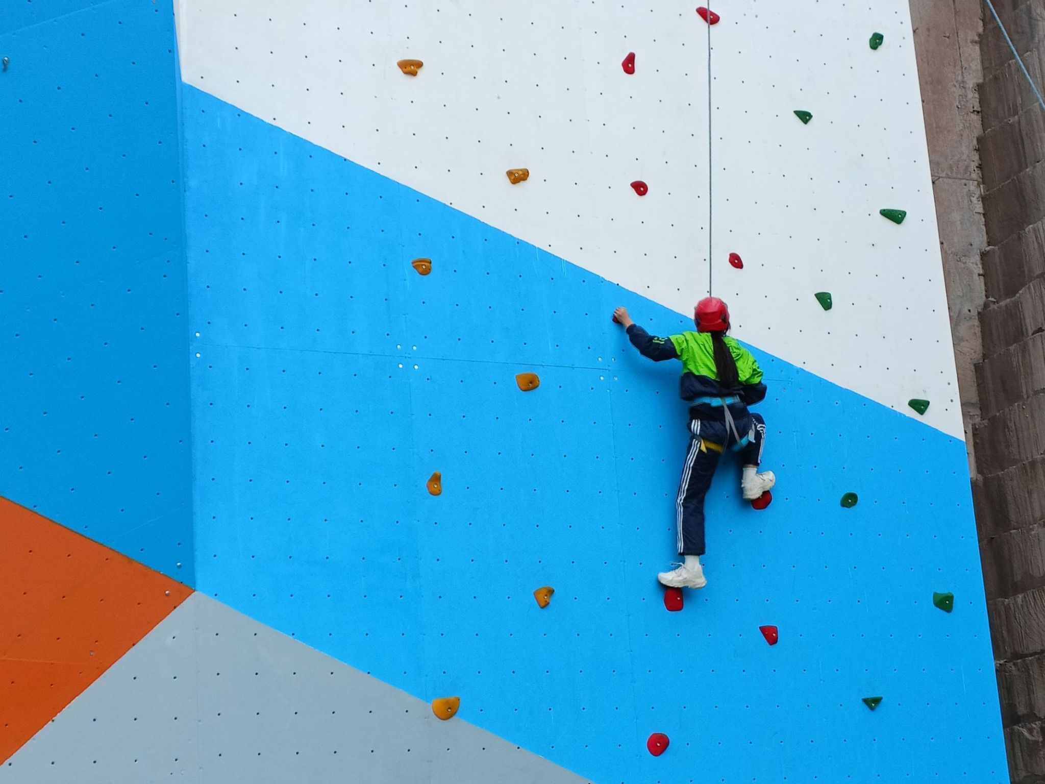在刚开始攀岩的时候,觉得没什么大不了,可到后面,我的手臂渐渐没了力气,爬到也越来越缓慢,底下的同学不停地喊加油。脚下突然一滑,我便与墙面分开了,很遗憾没能登顶,这让我想起我们的人生也是如此,我们一步一个脚印地往上爬,或许中途会有失误,也或许会疑惑不知道走哪条路,但只要脚踏实地,一定会登上高峰。