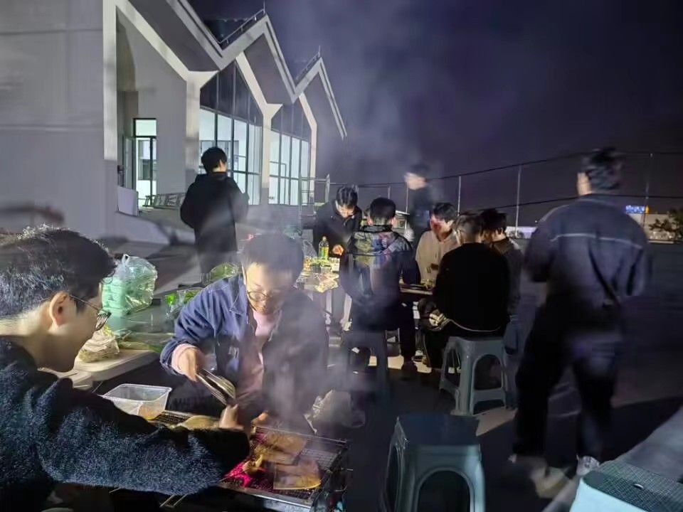 在明亮的篝火和轻松的音乐声中,队员们围坐在一起,分享美食、欢笑和友谊。晚会上,首先进行了烧烤环节,大家一边品尝美食,一边畅谈比赛的点点滴滴。烧烤的香气与队员们的欢笑声交织在一起,形成了一幅温馨而和谐的画面。