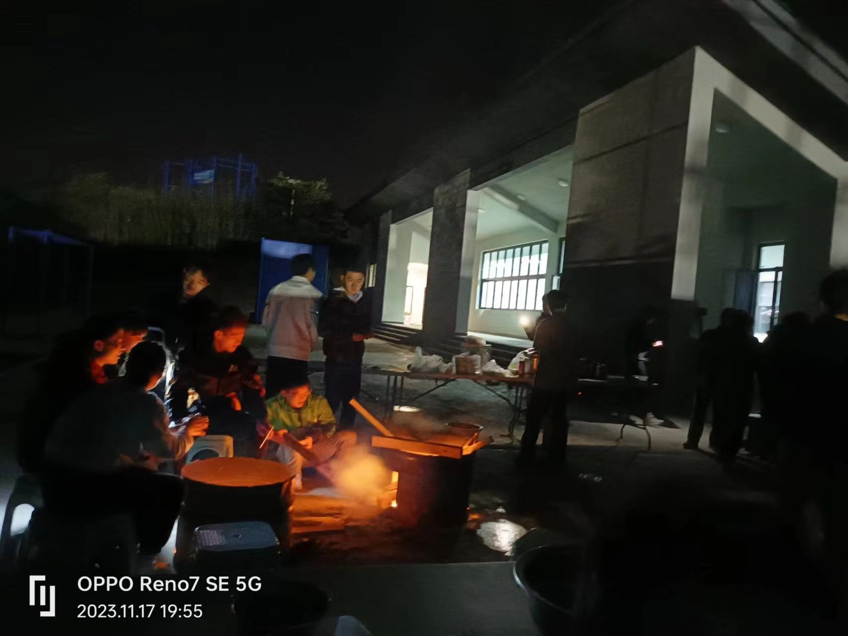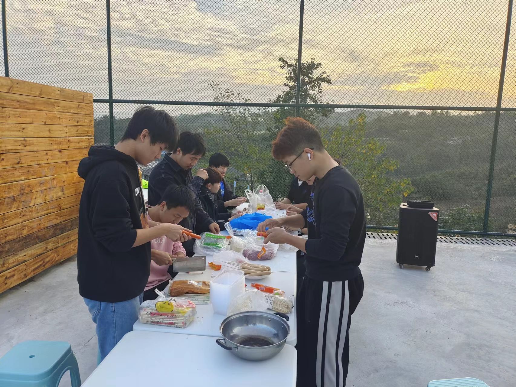 队员们在准备物资和食材的过程中,充分发扬了团结协作的精神,确保活动的顺利进行,队员们前往万达广场购买了食材、饮料、蛋糕等物品,向营地训练中心借用了烧烤架、大锅、刀板等炊事工具。队员们有的搭灶安锅,有的拾柴生火,或穿串串,或洗菜切肉,大家分工明确,忙得不亦乐乎。日落西山之时,天空染上了红橙色的余晖,仿佛整个大地都被这暖暖的色彩包裹着。