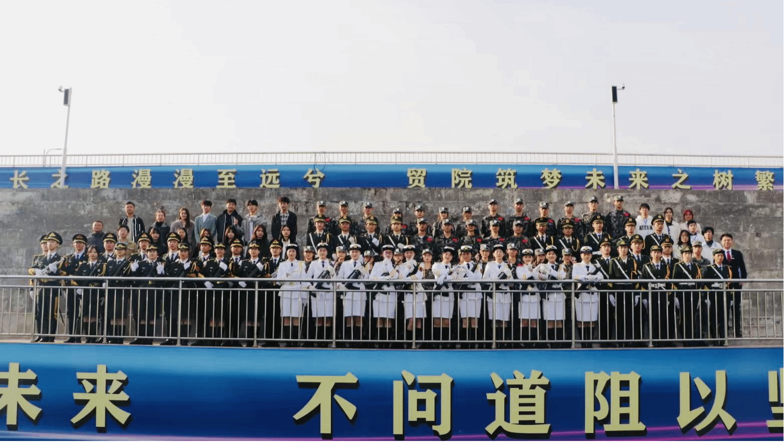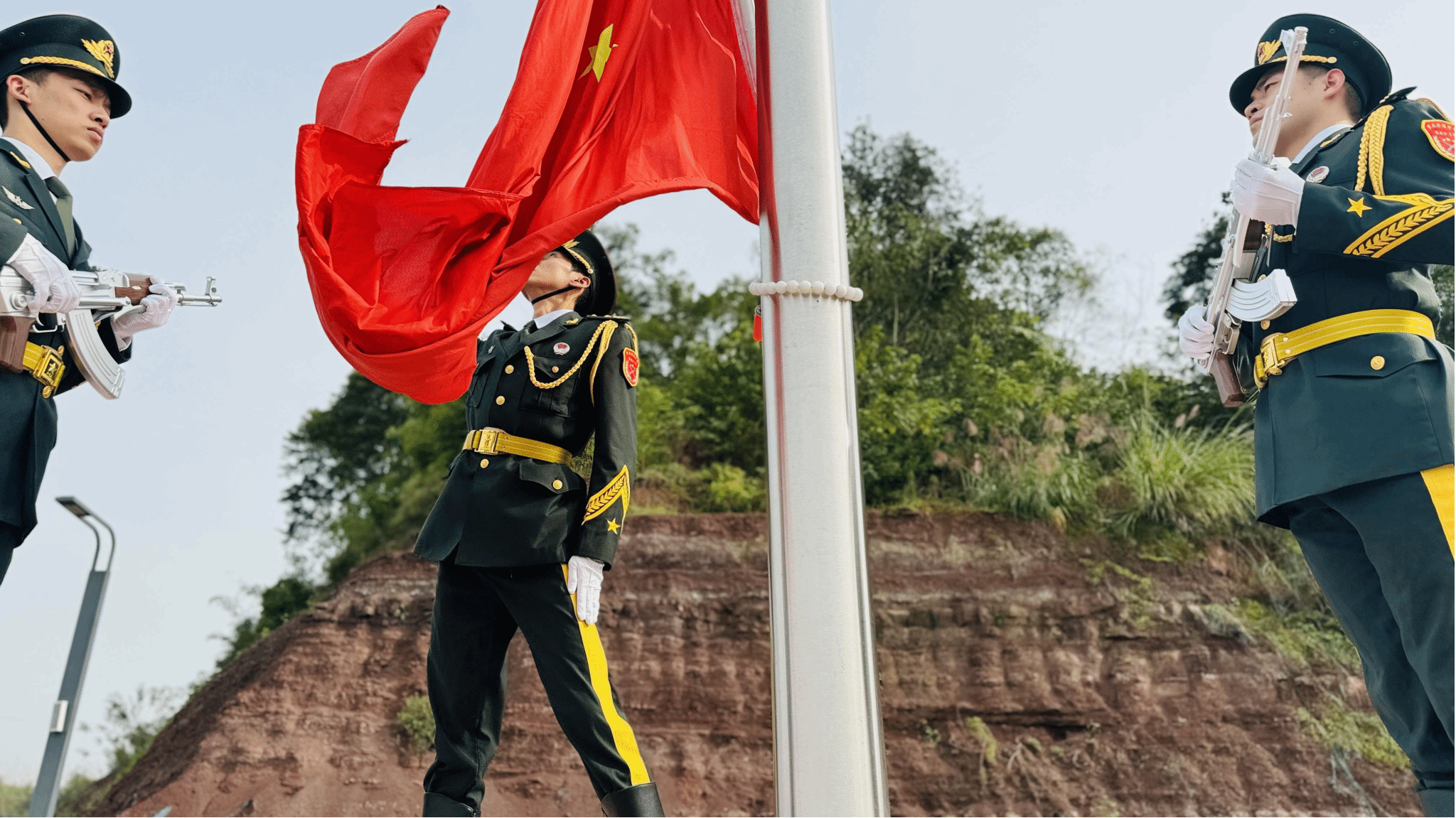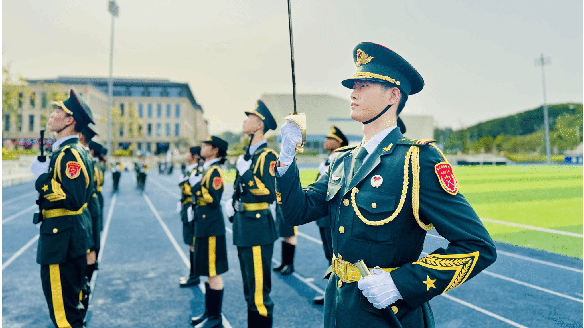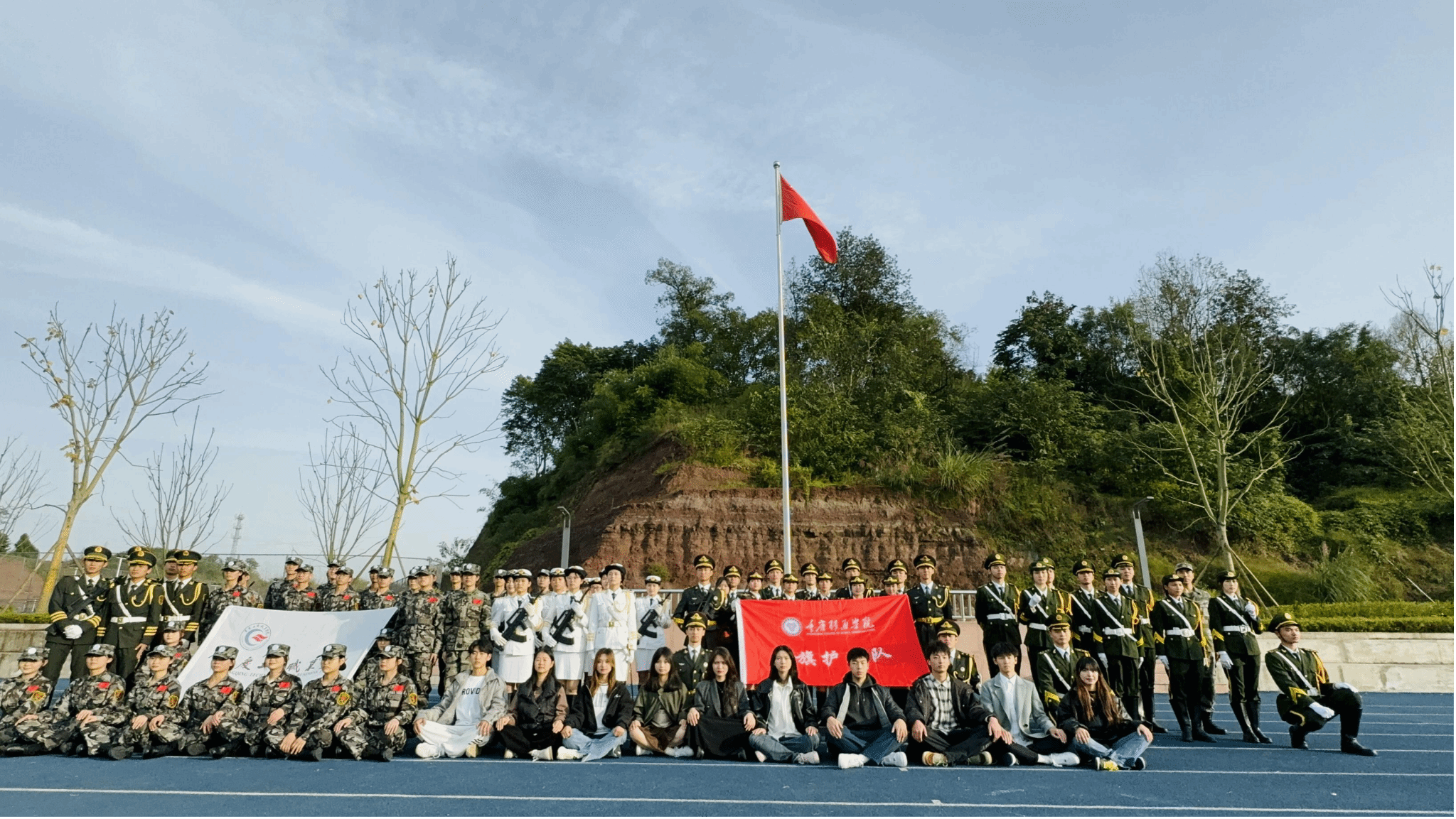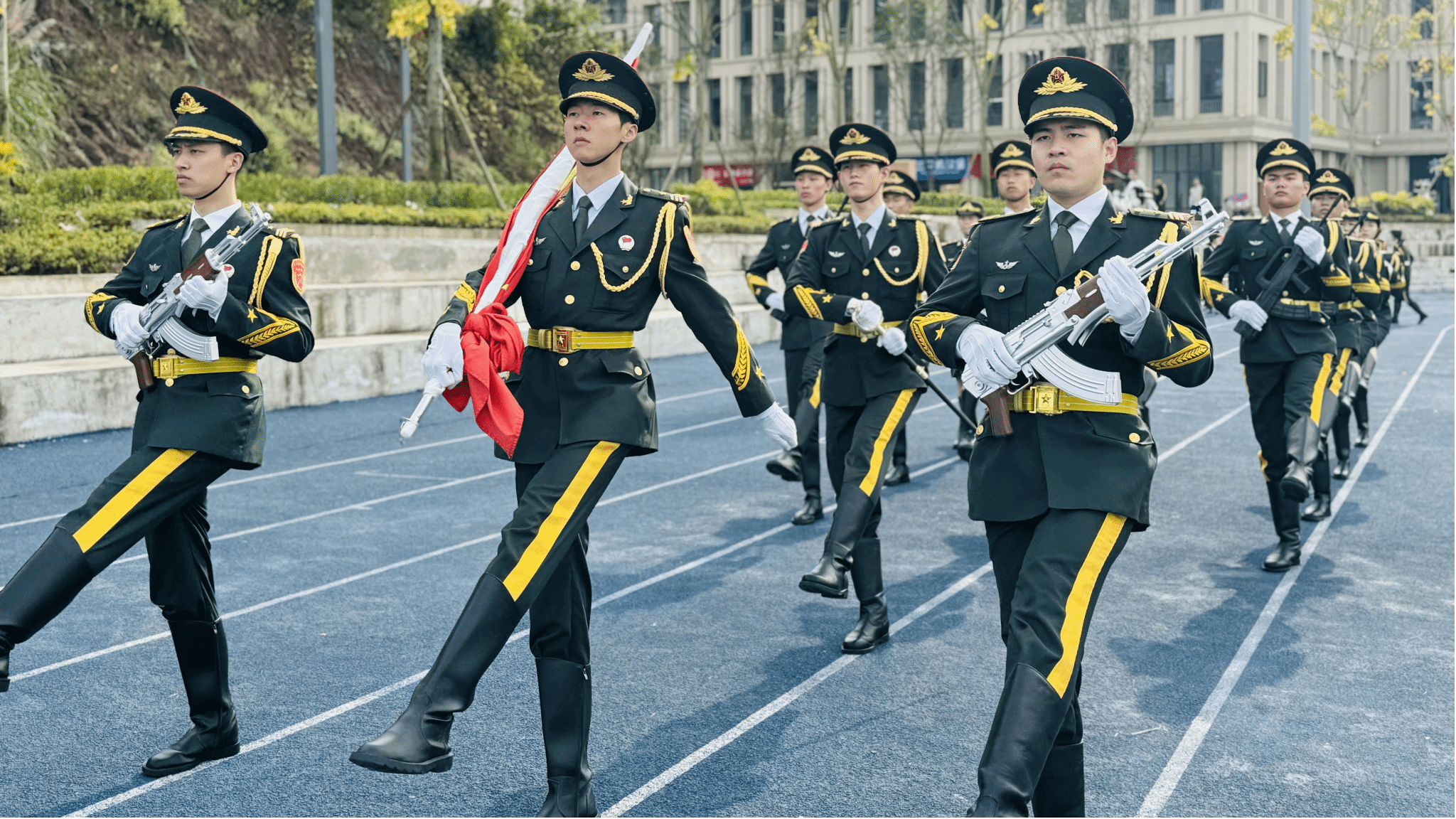 队列展示结束后,三校国旗班来到重庆对外经贸学院操场进行合影留念。片中,队员们身姿挺拔,眼神坚毅,展示着护卫国旗的决心。