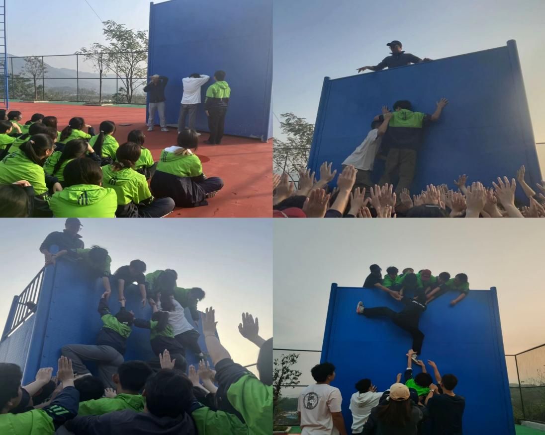 一次次失误,一次次重新出发。当我看到默默承受所有同学重量的肩膀与身躯,他们搭起人梯,他们拼尽全力;当我看到高墙上无数双手向我伸出,仿佛我们真的面临生死危难;当我做着俯卧撑,在教练一声声口令下,在同学们红了的眼眶里。我觉得我们都很了不起,我们是一个真正的团队,未来也会越来越好。