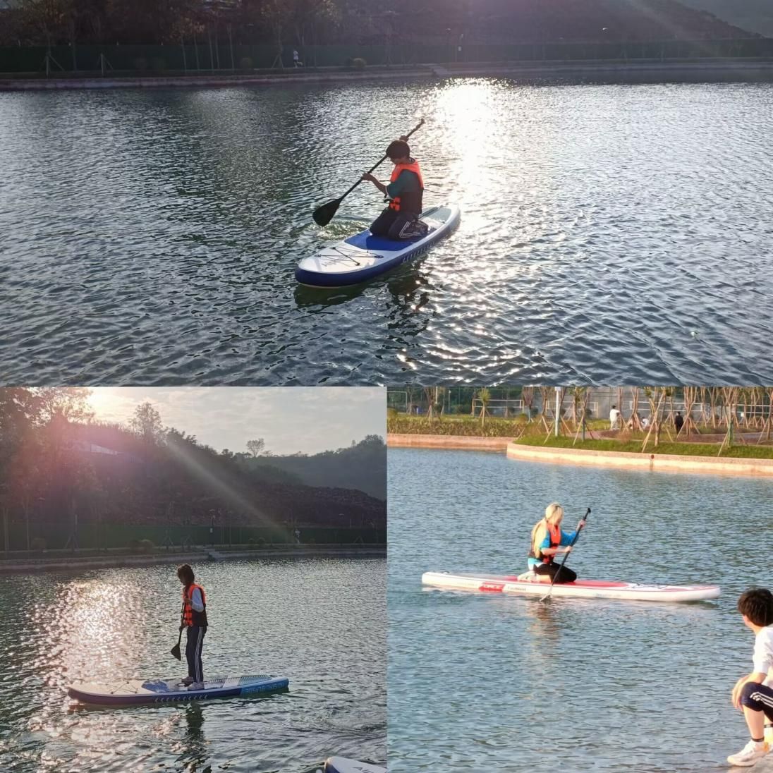 在所谓的“划船”项目时,我们通过小队教练专业的普及才知道原来它是浆板项目。在此项目中,大家都是第一次接触浆板,在教练的细致教学后,大家之间互相请教、互相学习、互相提醒,队长一直泡在水里协助队员们一一上板毫无怨言,在每个人练习过后,最终进行小队比拼,大家都安全且高效地完成了比赛。