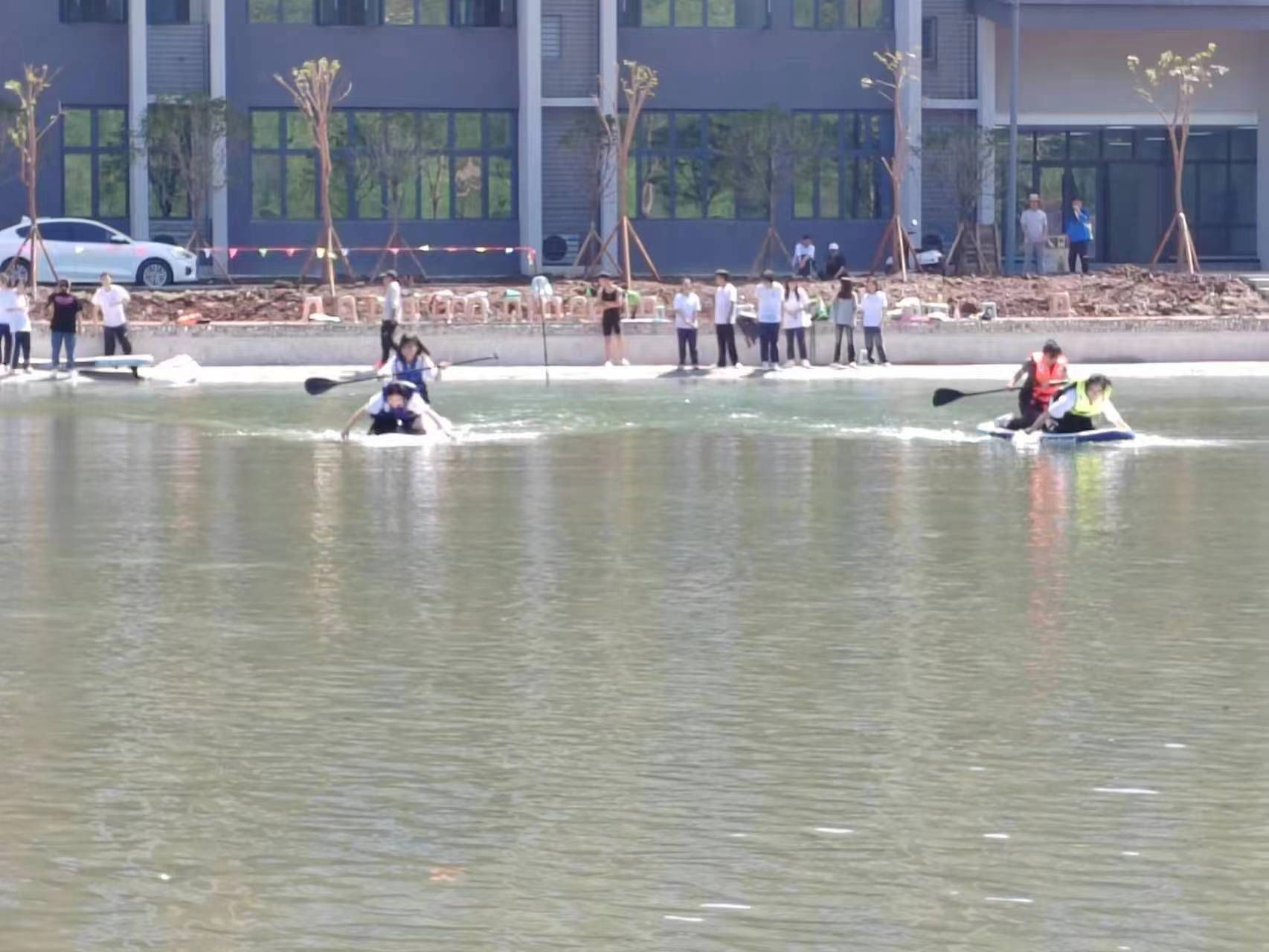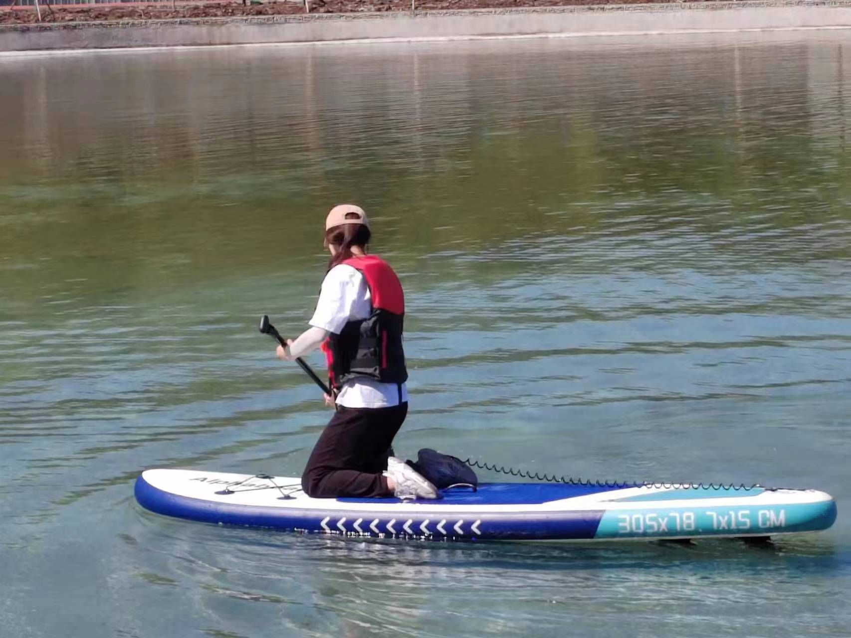 第二天的下午,教练带领大家来到学校的人工湖,开展浆板项目。首先是教练讲解关于浆板的知识和相关安全注意事项,随即,为大家演示上板动作和如何滑行,同学在教练绘声绘色的讲解中对此项目跃跃欲试。在波光粼粼的湖面上划动着桨板,在一片欢声笑语中,同学们的桨板体验结束了。
