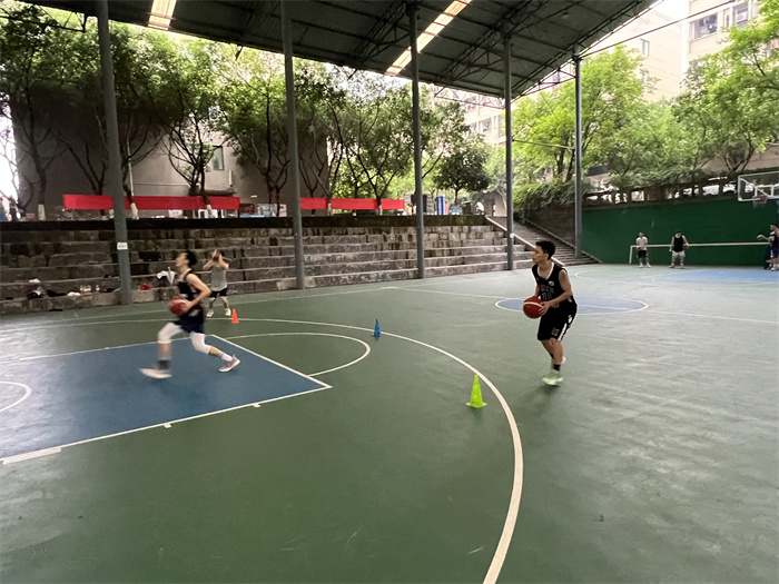 五月指导智能工程学院、大数据与计算机科学学院、数字经济与信息管理学院和中德学院篮球队训练。训练内容主要围绕抢篮板长传快攻、半场多点传切和半场联防,其目的是为了提升队员长传球准确度、进攻跑位意识和防守选位意识。