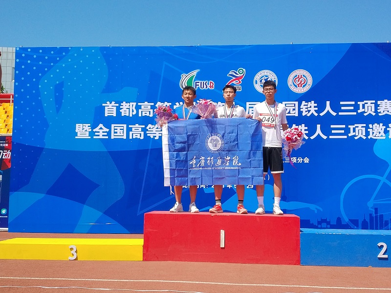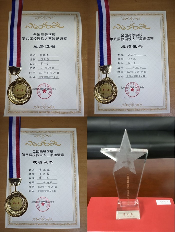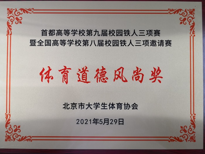 2021年5月29日,首都高等学校第九届校园铁人三项赛暨全国高等学校第八届校园铁人三项邀请赛在北京航空航天大学举行,参赛选手来自全国的35所高校共计265人。我校在竞技体育中心孙哲主任的带领下,黄静、郑万达两位教练携10名经过三轮校内选拔的运动员参赛,最终取得全国高校组男子小轮车三项、小轮车两项与女子水陆两项三个全国冠军,体育道德风尚奖及团体总分第三名的好成绩。