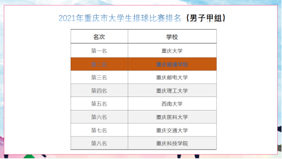 附:2021年重庆市大学生排球比赛排名(男子甲组)