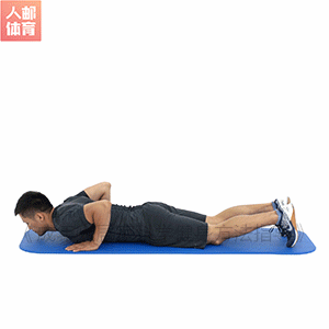 俯卧在垫上,双腿伸直,双臂在躯干两侧弯曲,肘部向后,双手在肩关节两侧掌心向下撑地。