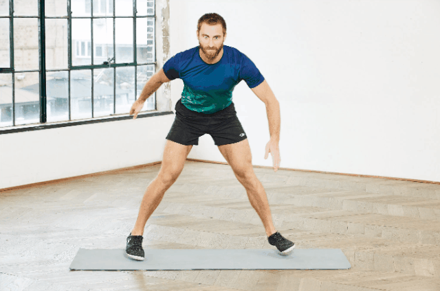 双脚并拢站立,臀部向后推,保持背部平直,腹肌用力,蹲下。尽可能往右边跳,当左腿向后摆动时,右脚轻轻地落下。然后尽可能往左边跳,用臀肌推开,右腿向后摆动,左脚轻轻落地。左右为一个循环。手臂继续重复摆动,就像在溜冰一样。