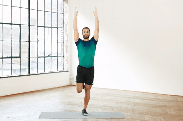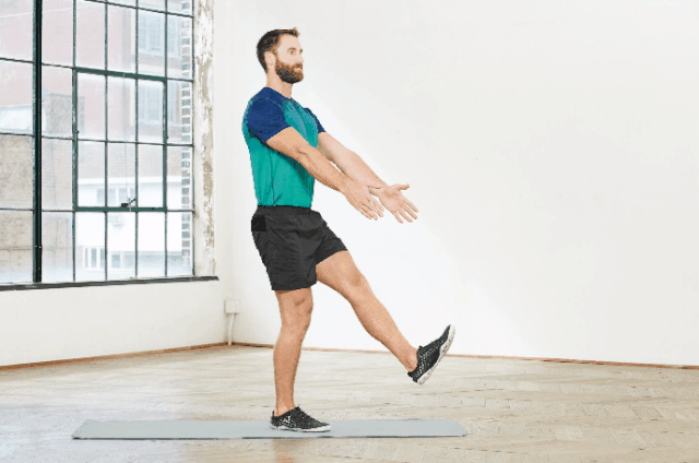 右腿单腿站立,抬起左腿。身体站直,伸直双臂,与左腿平行。将臀部向后移动,并保持右膝在右脚踝上方,往下蹲。双手可以伸出来保持平衡。返回起始位置,重复动作。然后换边重复。从浅蹲开始,然后逐渐蹲得更深一些。