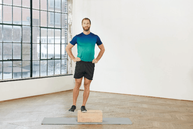 左脚站立在至少10厘米高的台阶或盒子上,右脚悬在边缘。保持臀部前倾,肩部水平。双手放在臀部上,以辅助平衡。保持左腿伸直,膝盖不弯曲,直接向上抬起右侧髋部,然后用臀部肌肉和核心将右脚降低到台阶下方。返回起始位置,有控制地缓慢重复动作。然后换边重复。