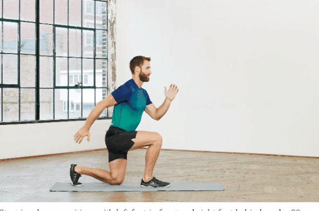 以弓箭步姿势开始,右脚在前,左脚在后,双膝弯曲90°。像短跑冲刺一样摆好手臂。当左脚向前跳跃时,右脚后跟向下压使其向上抬起,同时将左膝拉向胸部。借助手臂帮助向上跳跃。右脚轻轻落地,然后将左脚放在身后的垫面上,回到起始位置,重复动作。然后换边重复。