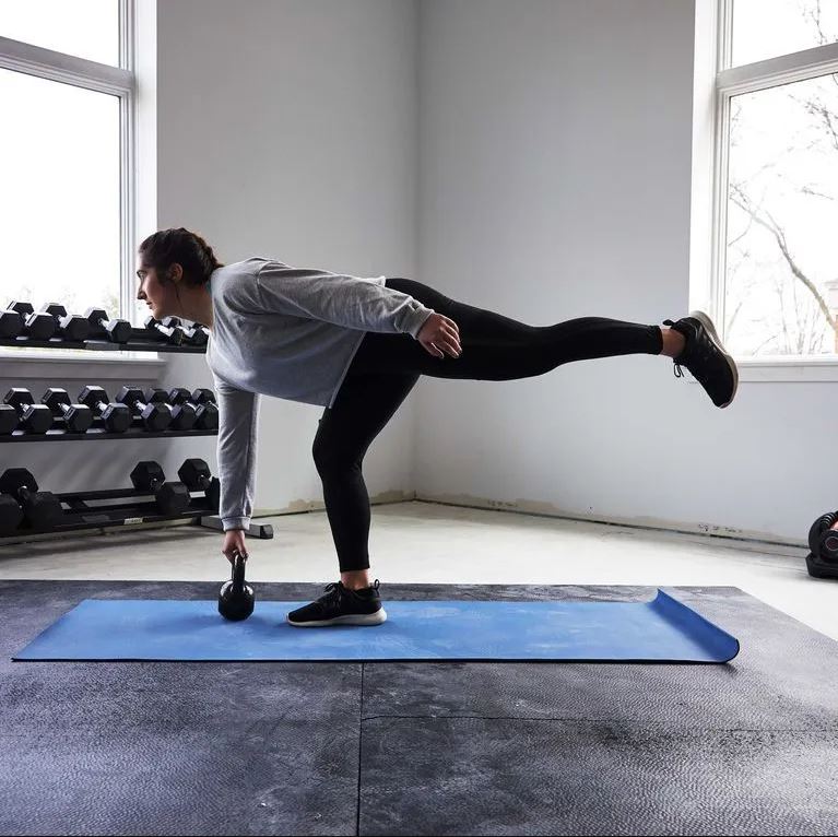双脚分开,与臀部同宽站立。将重心转移到右腿上,保持肩部向后和背部挺直。当左腿向后摆动时,双手伸向地面。回到起始位置,重复动作。然后换边重复。当你臀肌力量有所增强后,可以手握哑铃,提高难度。