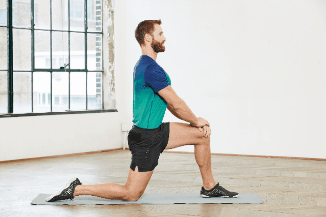 紧绷的髋屈肌会抑制臀肌的活动。每次跑步后或在臀肌锻炼前做这个伸展运动,可以激活臀肌。