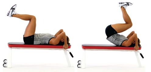 髋部抬离长椅,将膝关节靠向胸部后,缓慢降低髋部