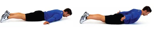 胸部抬离地面,同时拇指朝上,双臂向外侧旋转,保持1~2秒后,缓慢放下