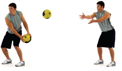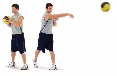 后侧手臂发力并伸展,将药球抛出
