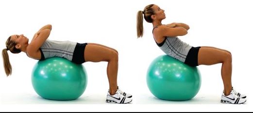 仰卧在稳定球上,屈膝90度,双脚与肩同宽,双臂交叉放于胸前