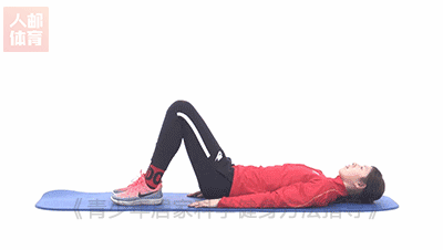 身体呈仰卧姿势,双臂伸直自然放于身体两侧,双腿屈膝,双脚着地。屈髋抬起双腿约与地面呈45度,一侧腿屈髋屈膝,使大腿靠向腹部。