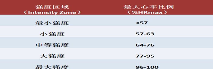 首先我们需要了解一下运动的强度,一种方法就是通过最大心率比例来控制,可以用220-年龄=最大心率(HRmax),然后按照强度比例进行换算。(见表2)