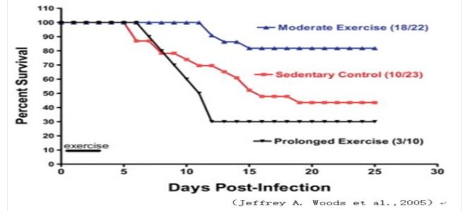 Jeffrey A. Woods等人(2005)研究发现,30分钟中等强度的运动,对患有流行性感冒病毒的小鼠的生存率明显比久坐和长时间运动的长(见图2 )。30分钟中等强度的运动适合疫情期间的运动负荷。