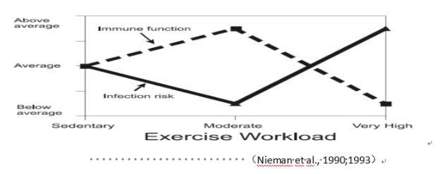 其实,他们和普通人一样也会因为运动负荷过大而导致上呼吸道感染的几率增加甚至还可能会高于普通人群(感染几率成“S”型曲线,中等的运动负荷感染风险最低,见图3)。