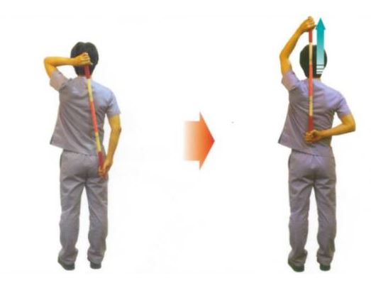 站立位,患侧握住木棍的下方,健侧握住木棍的上方,利用健侧上举木棍带动患肩做向上运动。(10次)