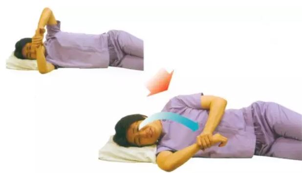 平卧于硬板床上,患肩朝下,尽量将肘部弯曲成90°,然后用健侧手抓住患侧上臂向下做轴向运动。