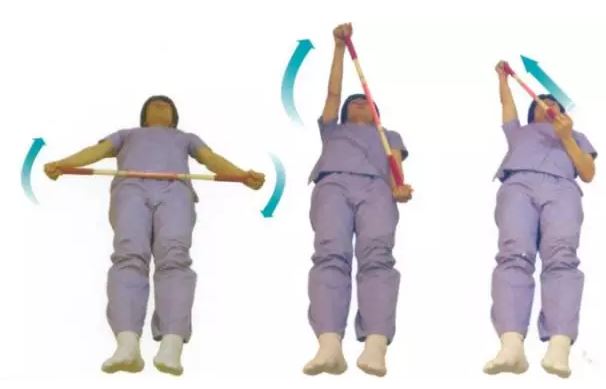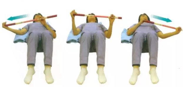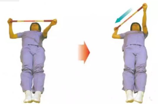 平躺在床上,双上臂握住木棍的两端,其中健侧伸直,患侧屈肘90°,利用健侧上臂将木棍下压使得患侧做肩关节90°位旋后运动。