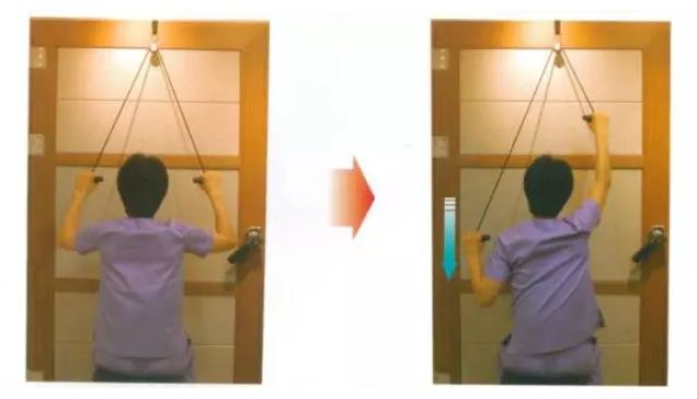 面对着门坐在椅子上,患侧的肩膀前屈135°,以健侧肩膀向下牵拉使患肩上抬(患侧不要用力),运动时以患肩能抬高到120°最好。