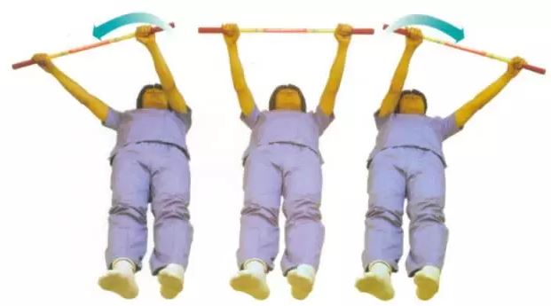 平躺在床上,双上臂握住木棍的两端,保持肘关节屈曲90°,患侧肘关节下方可垫毛巾,然后左右向运动,一个方向维持5秒后再转向另一个方向移动。(10次)