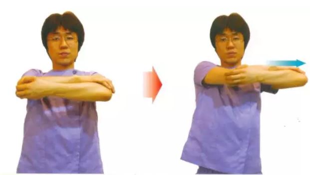 使用健侧上臂抓住患侧上臂,缓慢向身体内侧移动。
